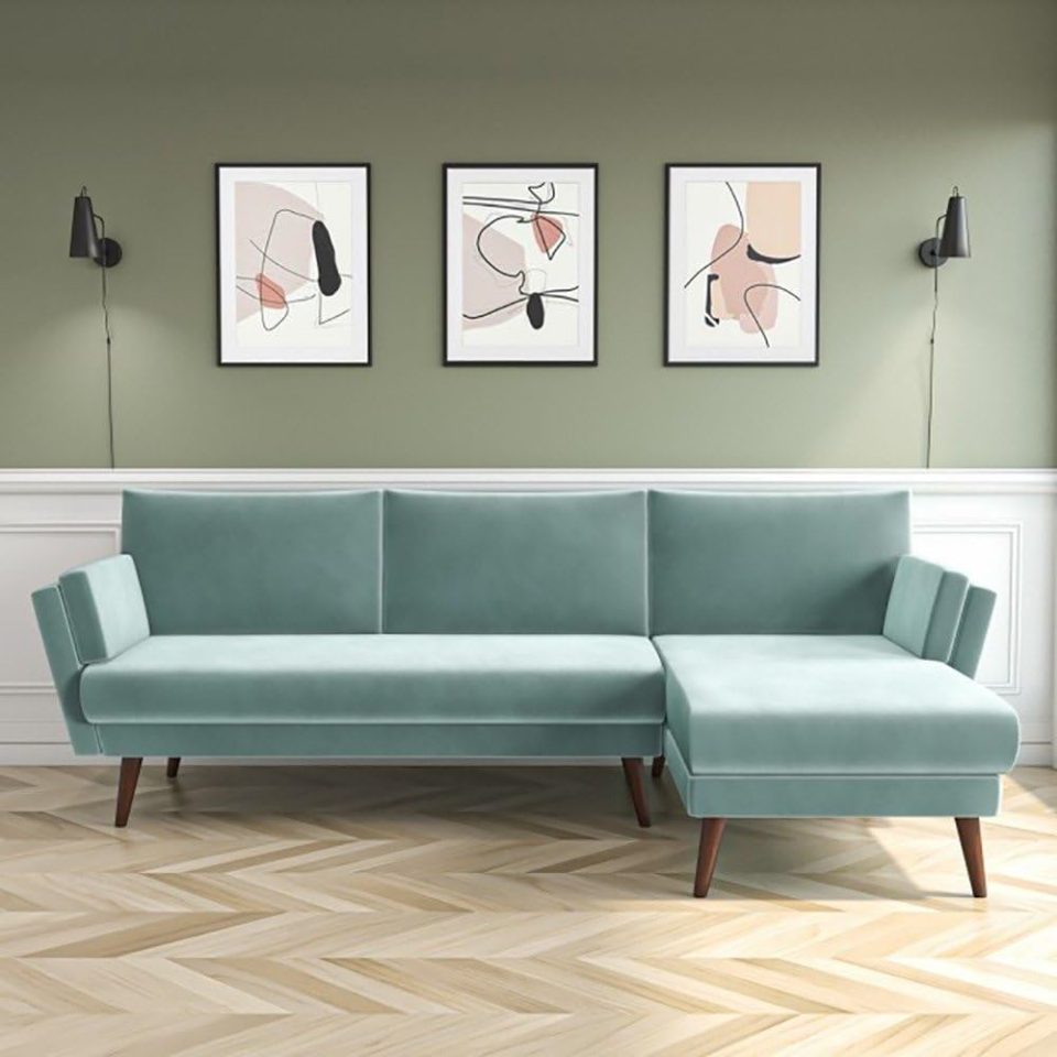 Home Mart Mint Green Velvet L Shaped Sofa – Right Hand Facing – Customizable Sectional Sofa for Living Room, Premium Upholstery, L-Shape Design