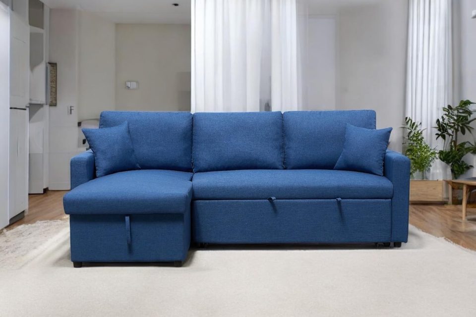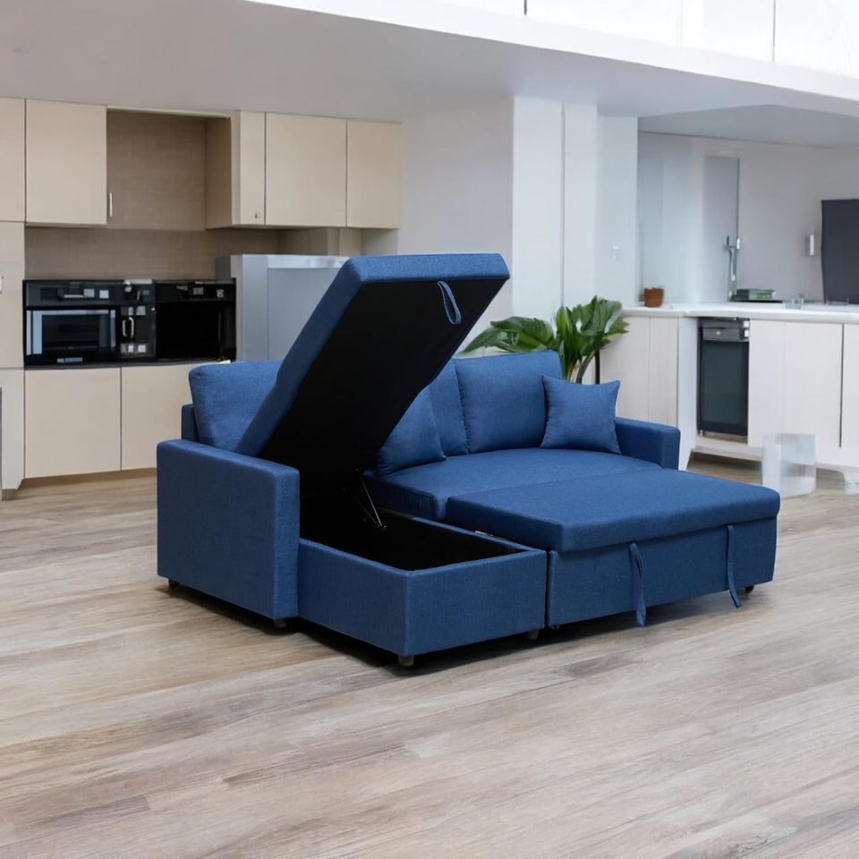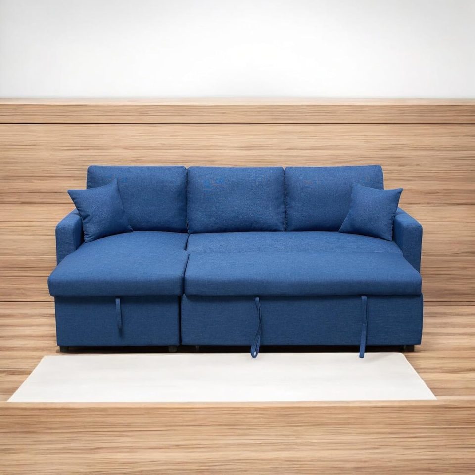 Plush Comfort: Upholstered in soft, durable blue fabric and padded with high-density foam cushions, this sofa offers superior comfort for lounging or sleeping.