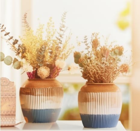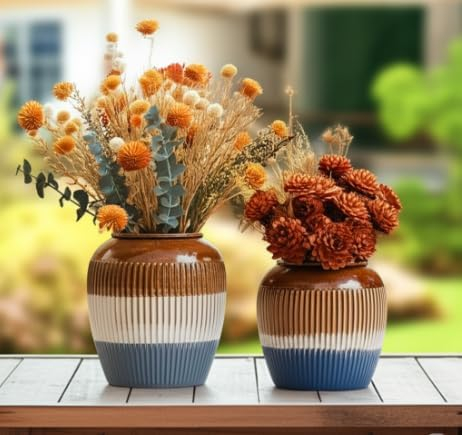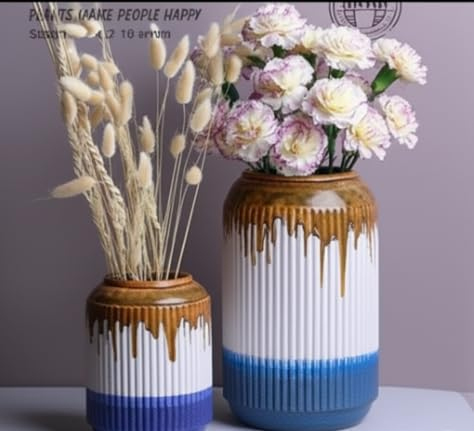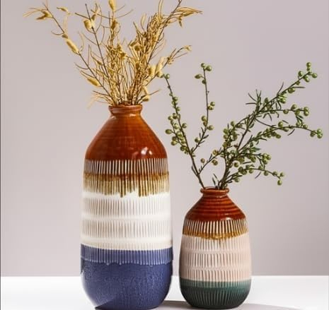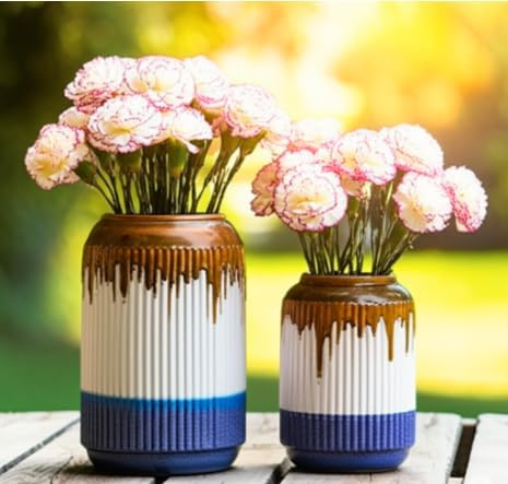 ✅ Elegant Handcrafted Design 🏺 Add a touch of artistic charm to your space with this beautifully handcrafted ceramic flower vase set. The ribbed texture and dual-tone glaze—featuring soft white, warm brown, and calming blue—offer a timeless look perfect for modern, rustic, or minimalist homes. A true centerpiece for any room.