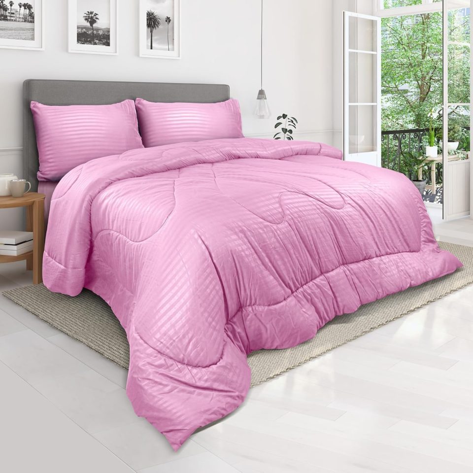 Pioneer Comforter Set with Flat Sheet & Pillow case – Ultra Soft Stripe Microfiber Fabric, Lightweight, Luxury, & Breathable Hotel Quality – All Season Fluffy (Pink, Queen : 220 x 240 cm)