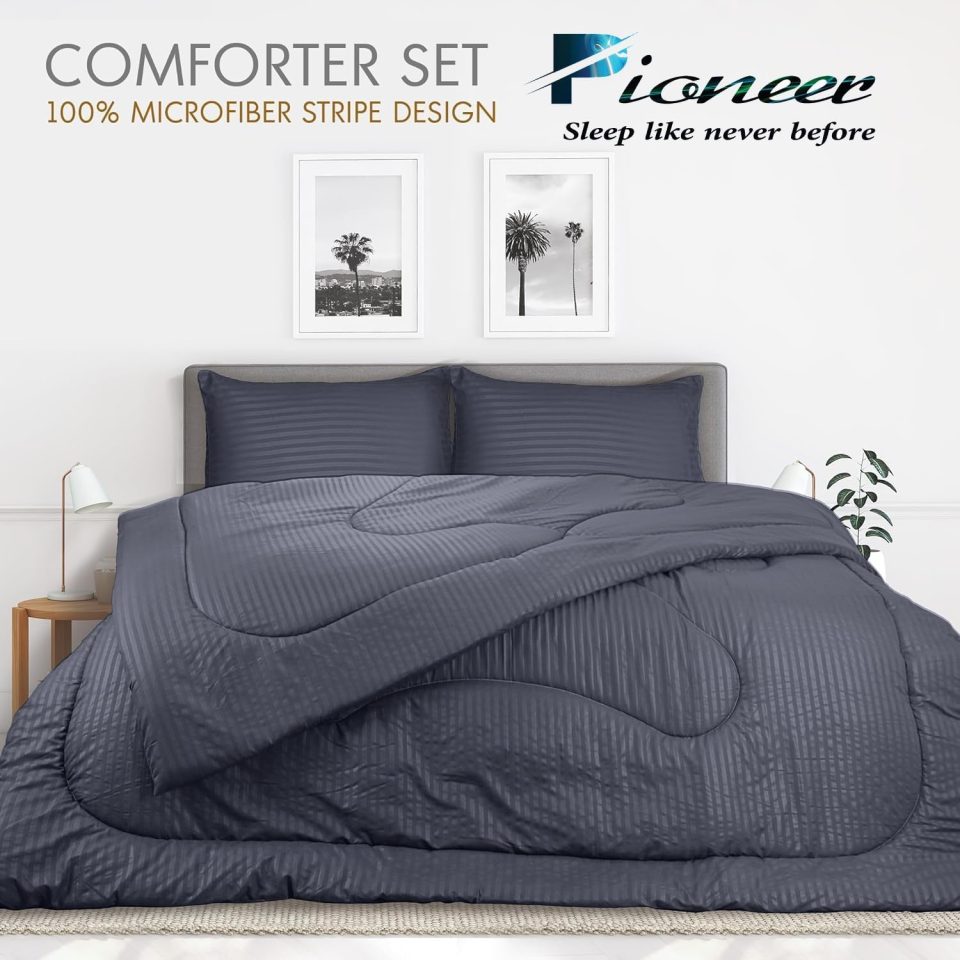 Pioneer Comforter Set with Flat Sheet & Pillow case – Ultra Soft Stripe Microfiber Fabric, Lightweight, Luxury, & Breathable Hotel Quality – All Season Fluffy (Dark Grey, Double : 200 x 220 cm)