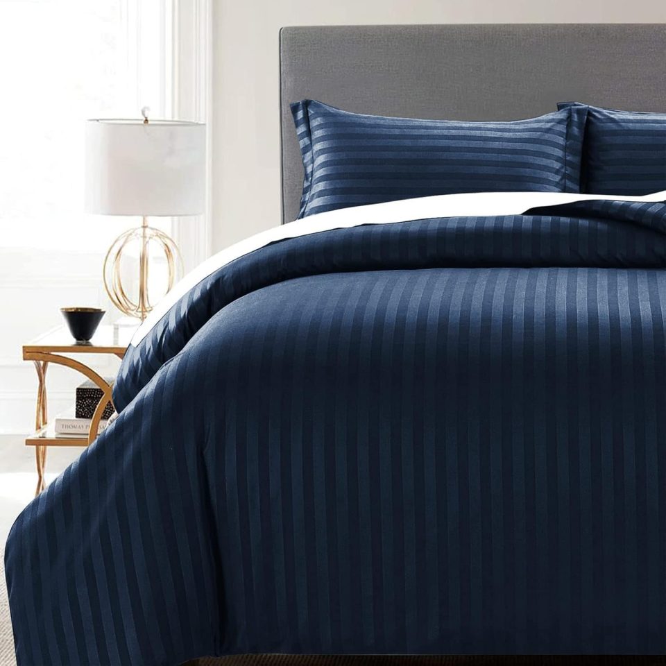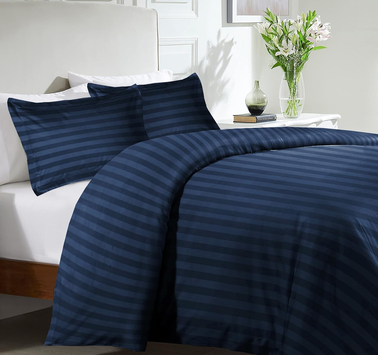 Home Mart Outlet Duvet Cover Sets Double Premium Hotel Quality Brushed Microfiber Satin Stripe Quilt Cover Set with Pillowcases Hypoallergenic Ultra Soft Microfiber (Navy Blue, King – 240 x 260 cm)