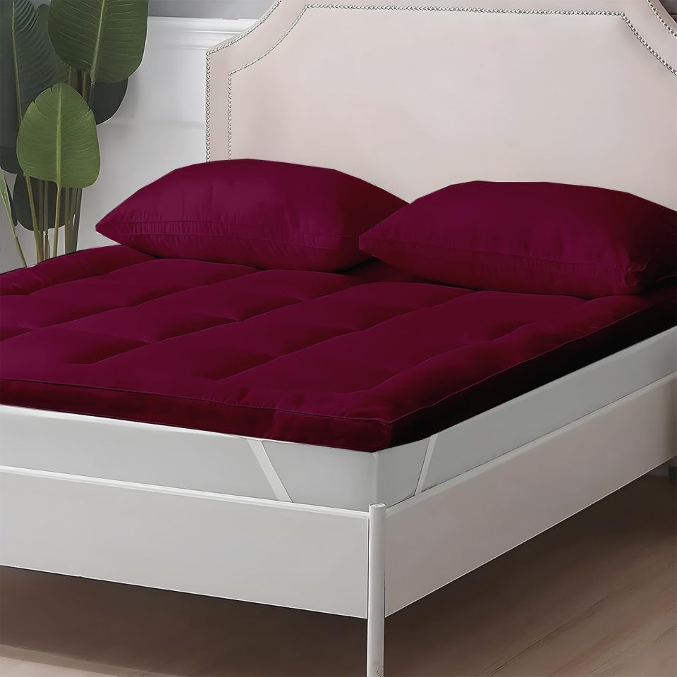 Microfiber Mattress Topper | 5cm Thick Mattress Topper (150×200) | Plain 90 GSM Luxury Bed Enhancing Topper | Mattress Cover with 4 Sided Elastic Band | (Queen, Maroon).
