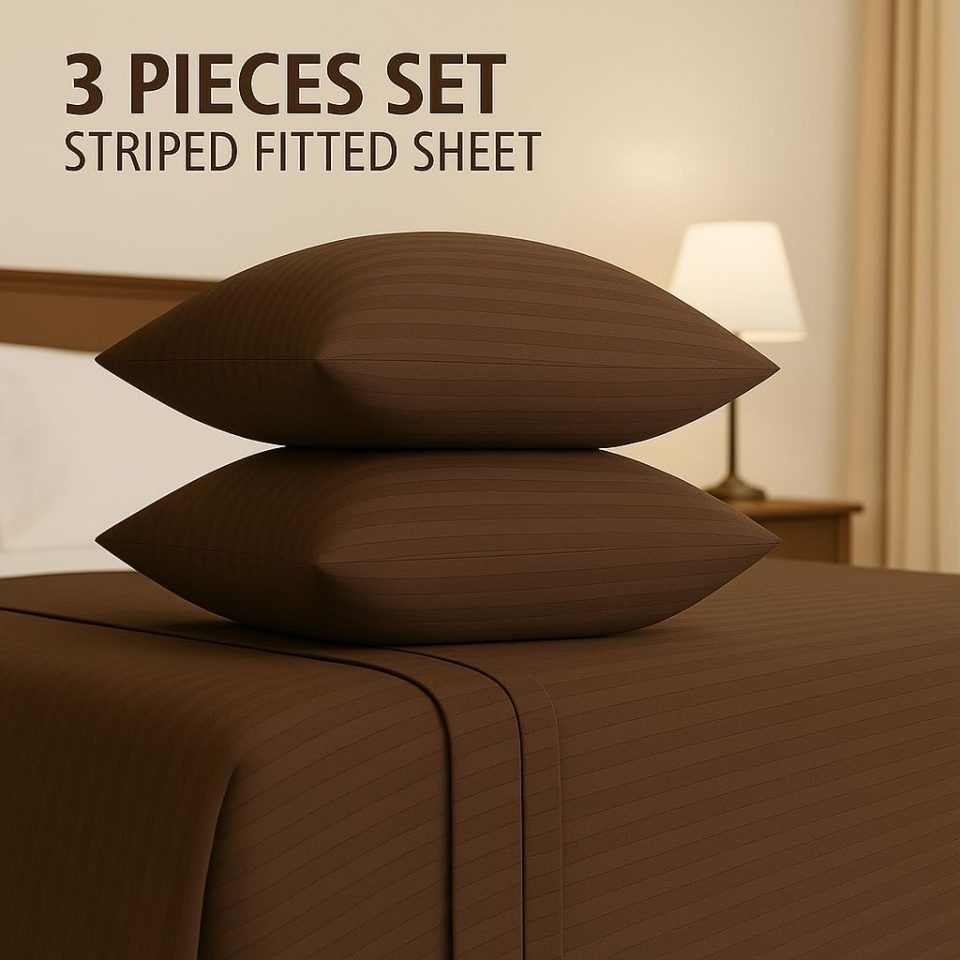 Home Mart Outlet Striped Microfiber Fitted Sheet Set – Twin 90×200 cm – Chocolate Color – 1 Fitted Sheet & 2 Pillowcases (50×75 cm) – Deep Pocket, Soft, Durable, Wrinkle-Resistant Bedding Set