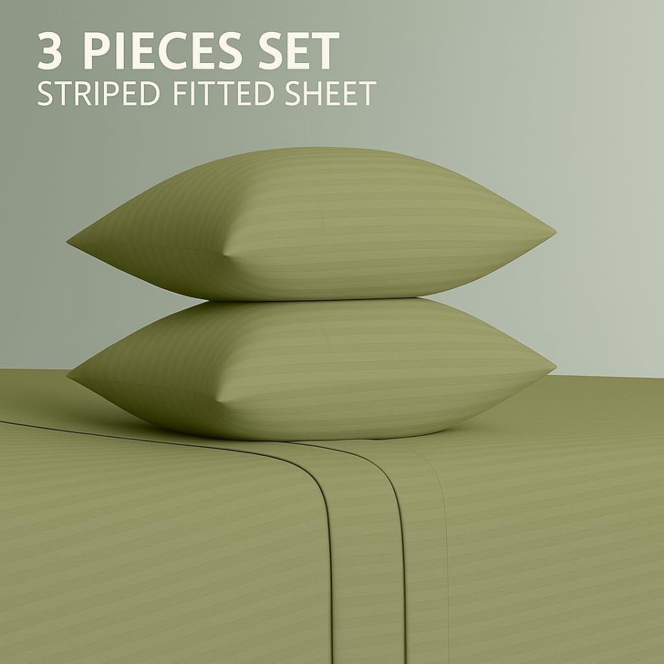 Home Mart Outlet Striped Microfiber Fitted Sheet Set – Twin 90×200 cm – Olive Green Color – 1 Fitted Sheet & 2 Pillowcases (50×75 cm) – Deep Pocket, Soft, Durable, Wrinkle-Resistant Bedding Set