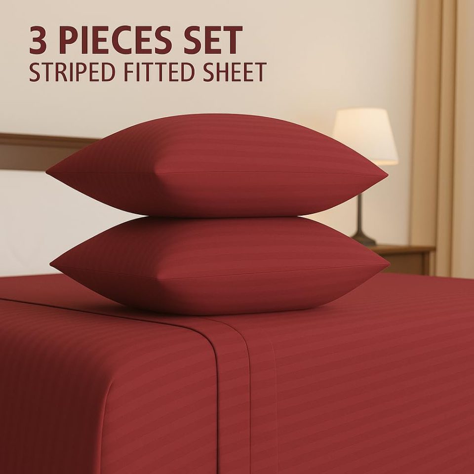 Home Mart Outlet Striped Microfiber Fitted Sheet Set – Twin 90×200 cm – Maroon Color – 1 Fitted Sheet & 2 Pillowcases (50×75 cm) – Deep Pocket, Soft, Durable, Wrinkle-Resistant Bedding Set