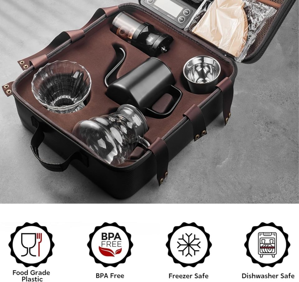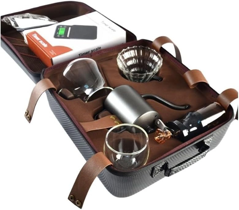 🔹 👜 Portable & Travel-Ready Design This coffee set comes packed in a zippered travel bag with dedicated compartments, making it easy to transport without damaging any components. Whether you’re camping, traveling, or working at the office, this kit ensures fresh coffee is always within reach.