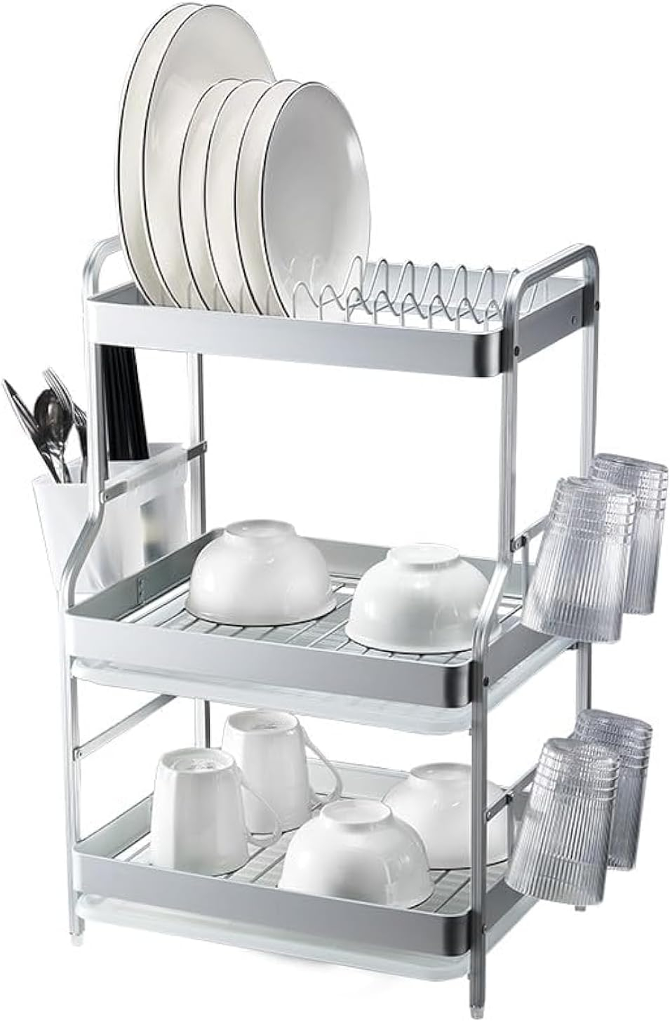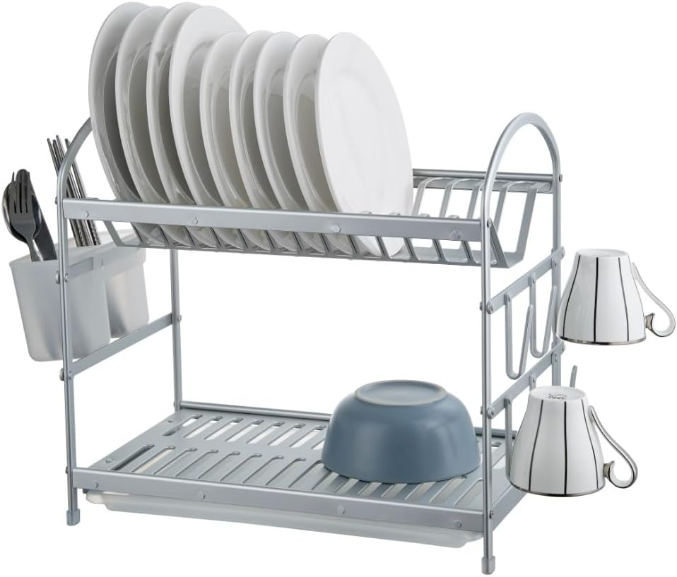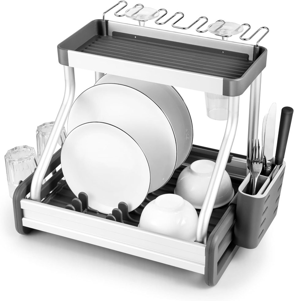 Aluminum Dish Rack Aluminum+PP,2-Tier Dish Rack with Utensil Holder and Drainboard, White
