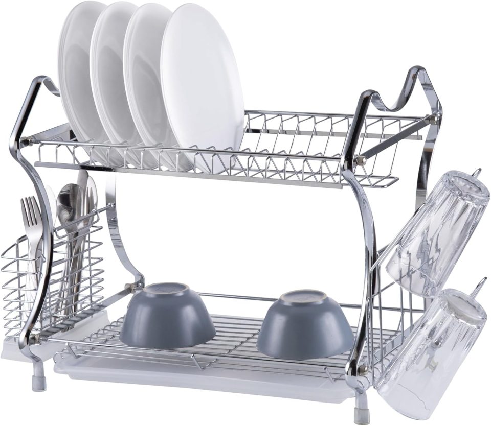 Dish Rack Iron W/Chrome Plated + PP Plastic, Plastic Color: Transparent White2-Tier Dish Rack with Plate Holders, Utensil Holders, and Drip Tray, Chrome Plated