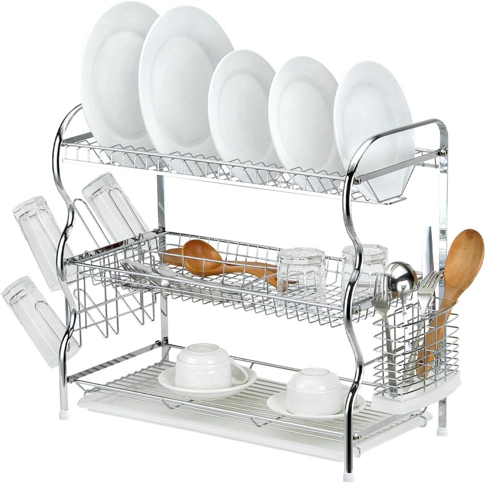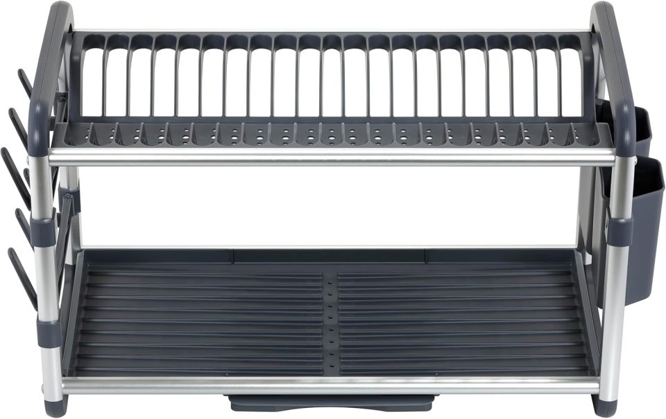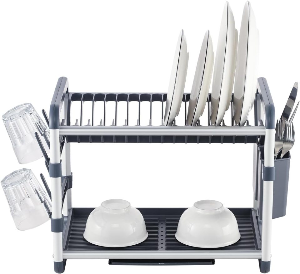 Large Double Dish Rack, Aluminum + PP Plastic, Plastic Color: Grey, With 3 Tiers and Utensil Holders