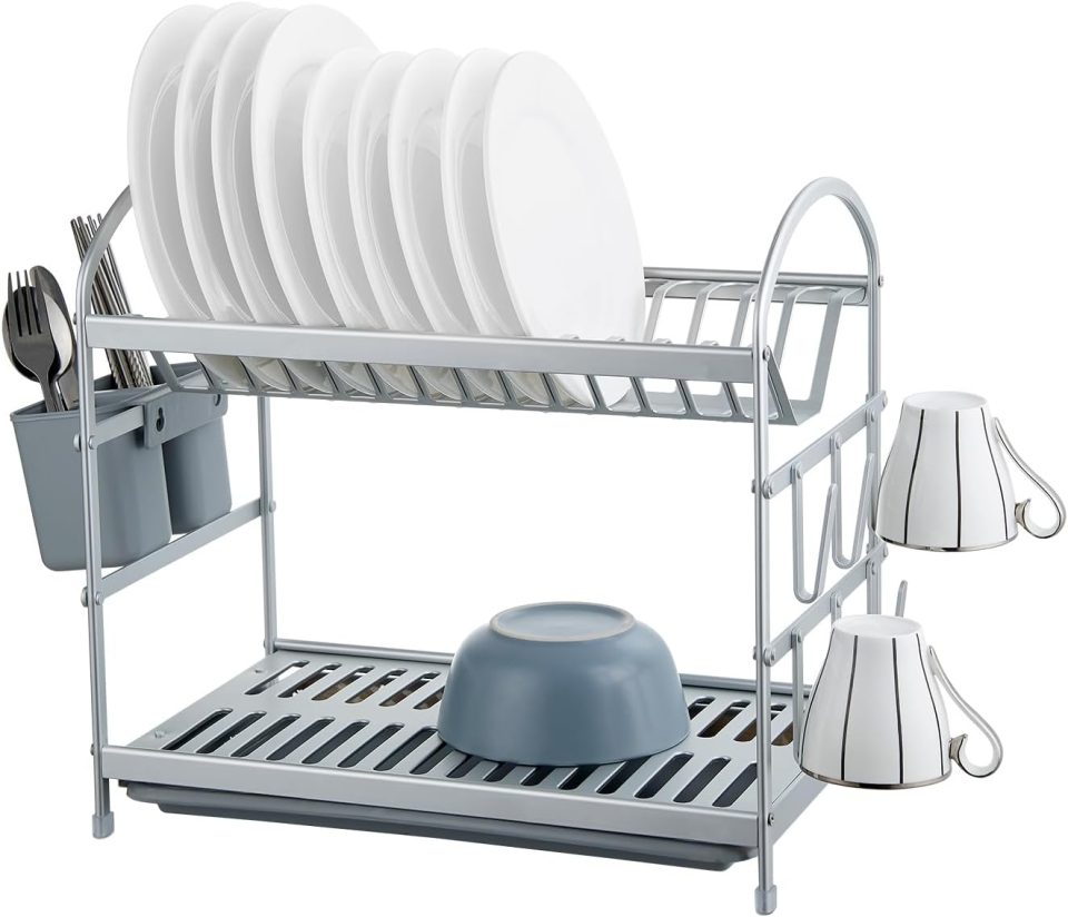 Dish Rack Silver Aluminum Aluminum+PP+ABS, Grey,Dish Rack with Utensil Holder and Drain Tray