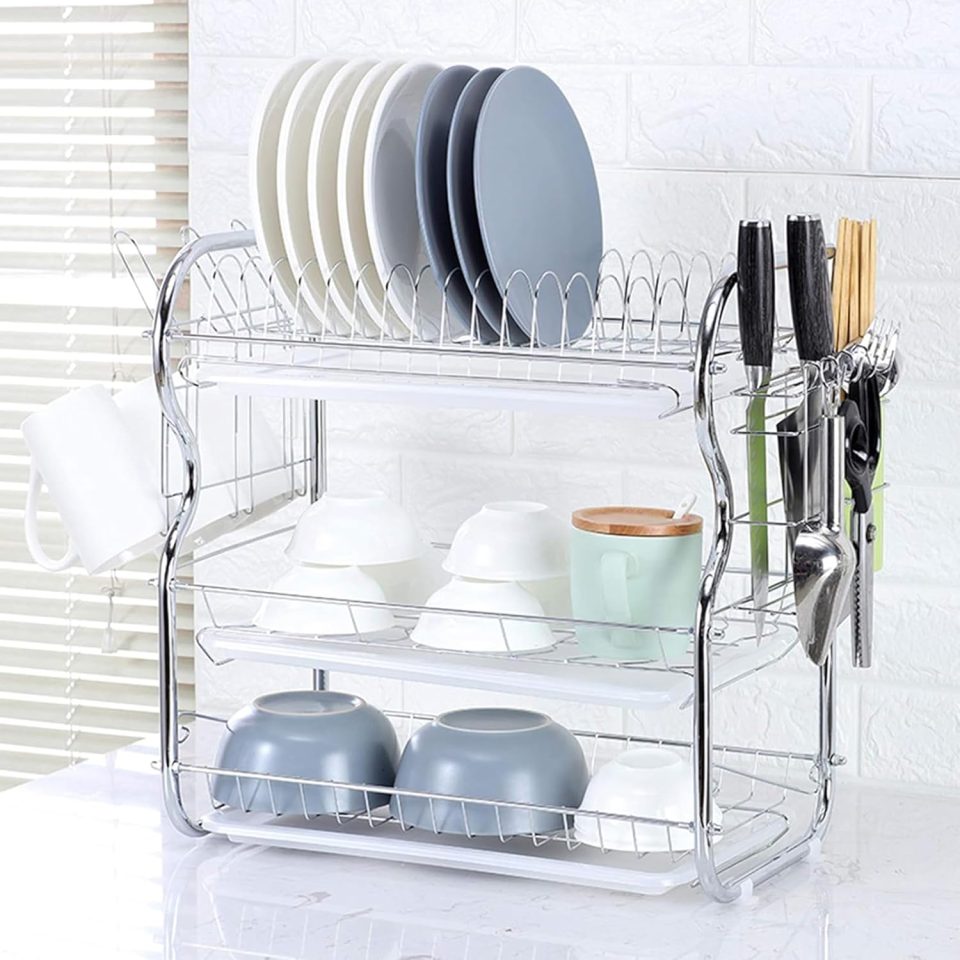 LARGE CAPACITY: This 3-Tier Dish Drying Rack offers three spacious tiers to neatly organise plates, bowls, cups, and cutlery, ensuring maximum storage for your kitchen. Includes a detachable drain board to keep countertops clean and dry, making it an essential for modern kitchens.