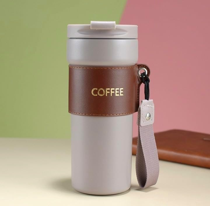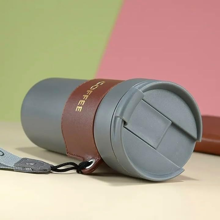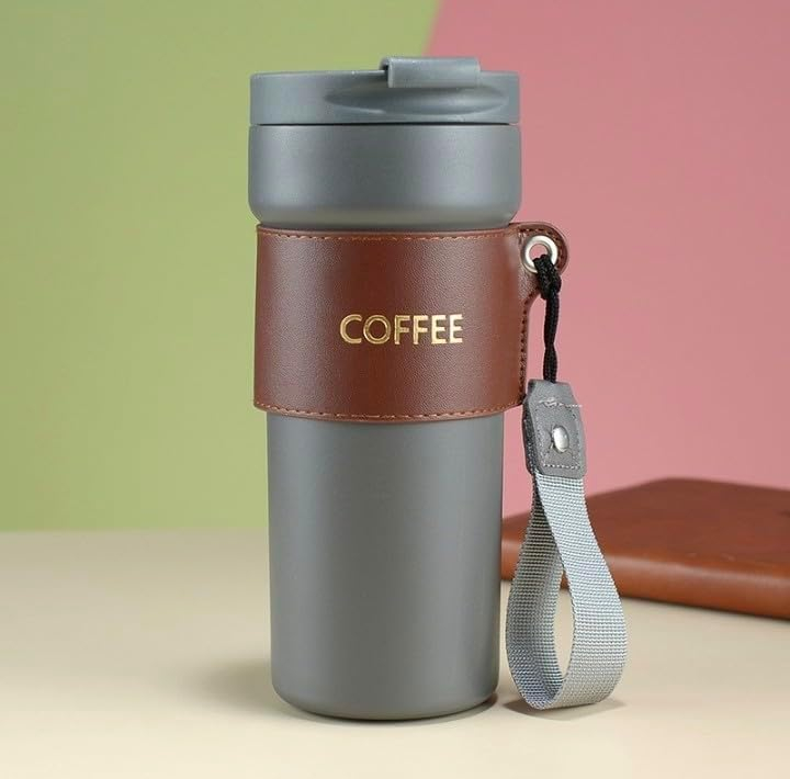 Portable Leather-Trimmed Coffee Mug with Lid, 500ml,Vacuum Insulated Tumbler, Black (grey)