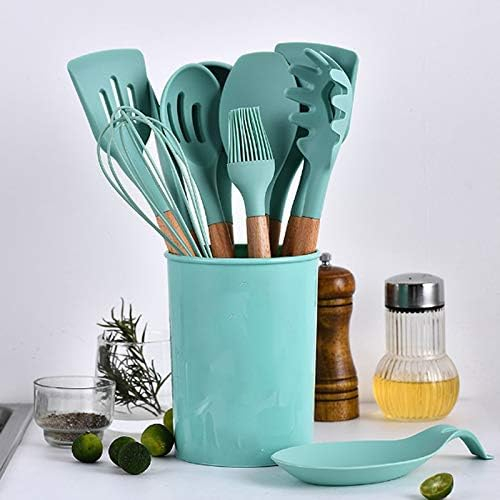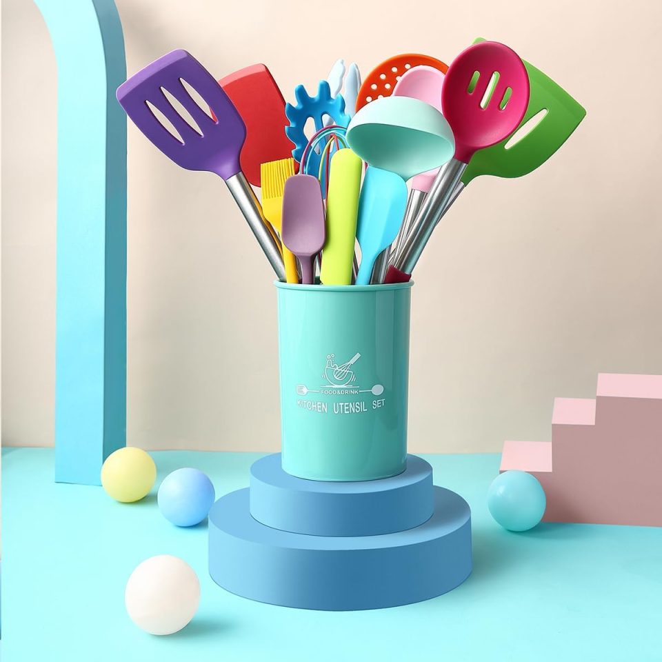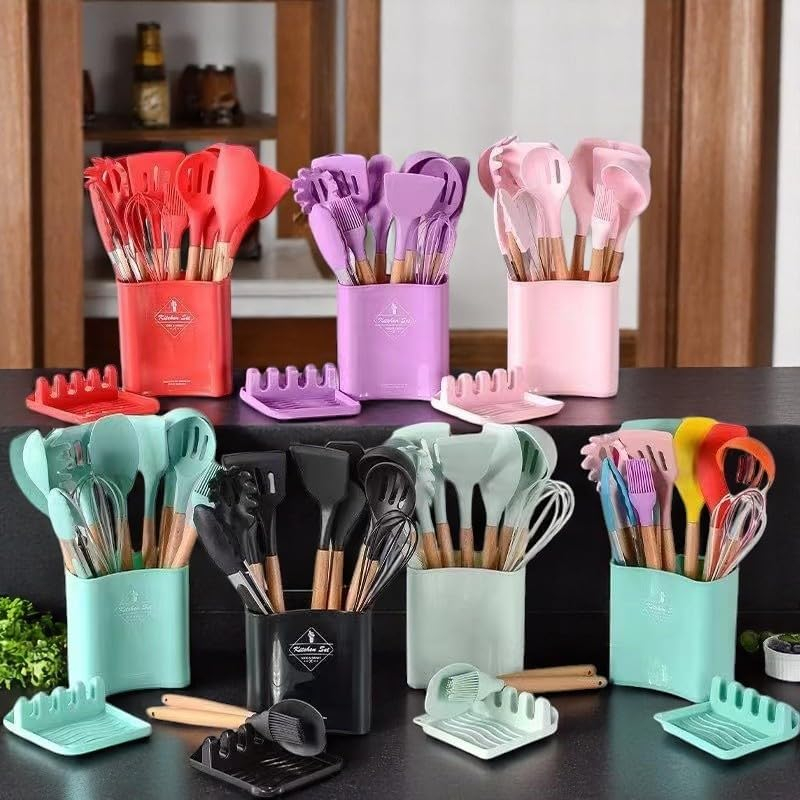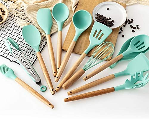 13-Piece Silicone Cooking Utensils Set Heat-Resistant,Non-Stick Kitchen Tools with Ergonomic Wooden Handles,Includes Spatulas,Turner,Ladle,Tongs, Whisk & More BPA-Free & Dishwasher Safe (Multi Color)