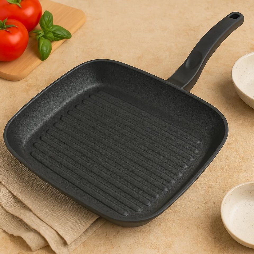 B&S “PROF” Grill Pan 26×26 cm – Optima Non-Stick Square Grill with Fixed Black Handle – Durable Die-Cast Aluminum – Kitchen Accessory for Grilling Meat & Veggies – Eco-Friendly Cookware