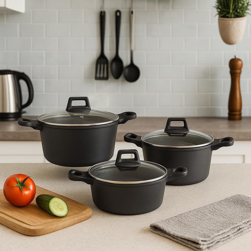 ✅ Transparent Tempered Glass Lids with Steam Vents 🔍 Each pot is paired with a tempered glass lid that allows you to check the cooking progress without removing the cover. The lids are designed with built-in steam vents that help manage moisture levels and prevent boil-overs. The transparency of the glass adds convenience by keeping your cooking visible at all times.