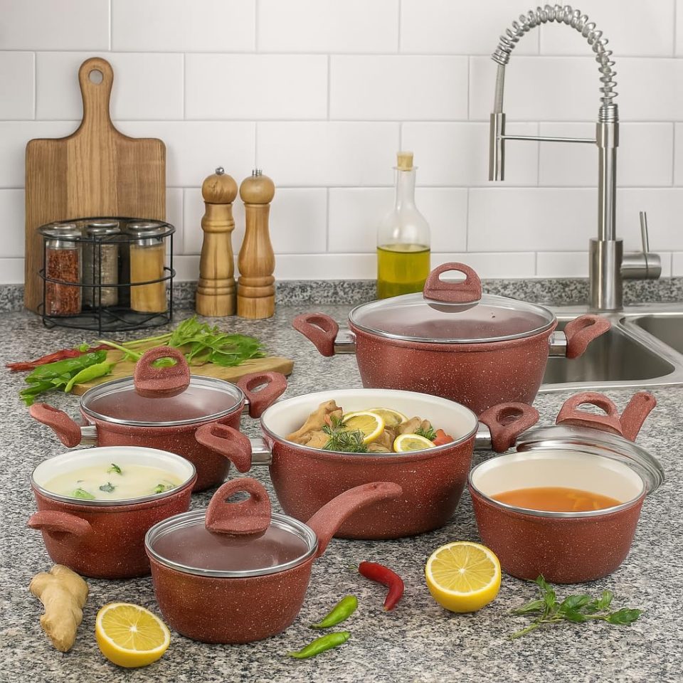 ✅ Marble Non-Stick Interior for Easy Cooking and Cleaning 🍳 The pots and pans are coated with a smooth marble-effect non-stick surface that helps prevent food from sticking. This makes it easier to prepare meals using less oil and also simplifies the cleaning process. The non-stick coating supports more consistent cooking by allowing food to move freely, reducing the chances of burning or uneven results.