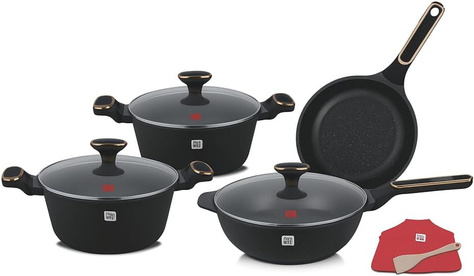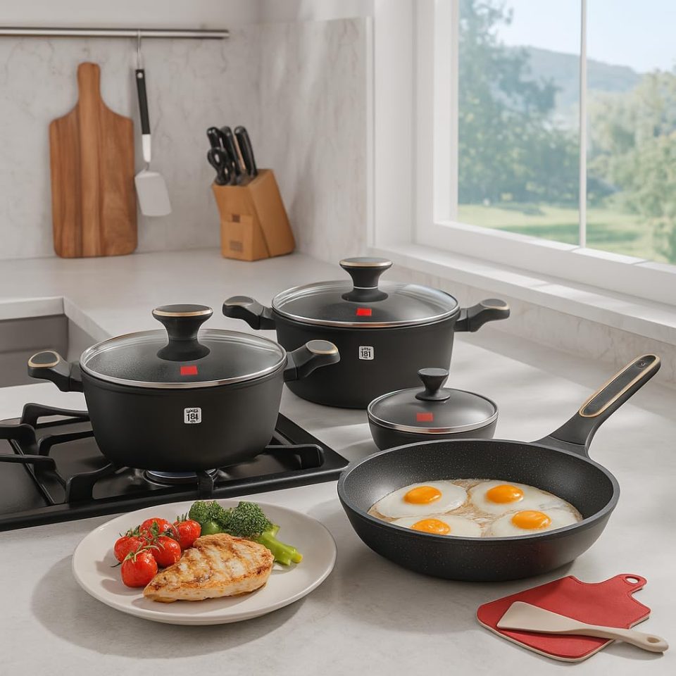 ✅ Durable and Lightweight Imitation Die-Cast Aluminum Build ⚙️ The cookware set is made from aluminum that mimics the appearance and feel of traditional cast iron but is lighter and easier to handle. This construction helps ensure even heat distribution while maintaining a manageable weight, making the pots and pans suitable for daily use without added strain.