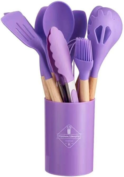 13-Piece Silicone Cooking Utensils Set Heat-Resistant,Non-Stick Kitchen Tools with Ergonomic Wooden Handles,Includes Spatulas,Turner,Ladle,Tongs,Whisk & More BPA-Free & Dishwasher Safe (Purple)