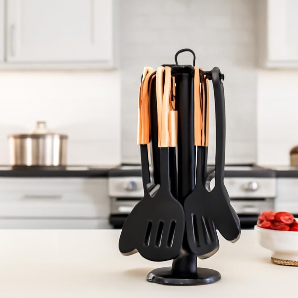 7-Piece Nylon Cooking Utensil Set with Durable Stainless Steel Handles – Heat-Resistant, Non-Scratch Kitchen Tools for Nonstick Cookware – Spatula, Ladle, Turner, Spoon & More (Black And Beech Wood)