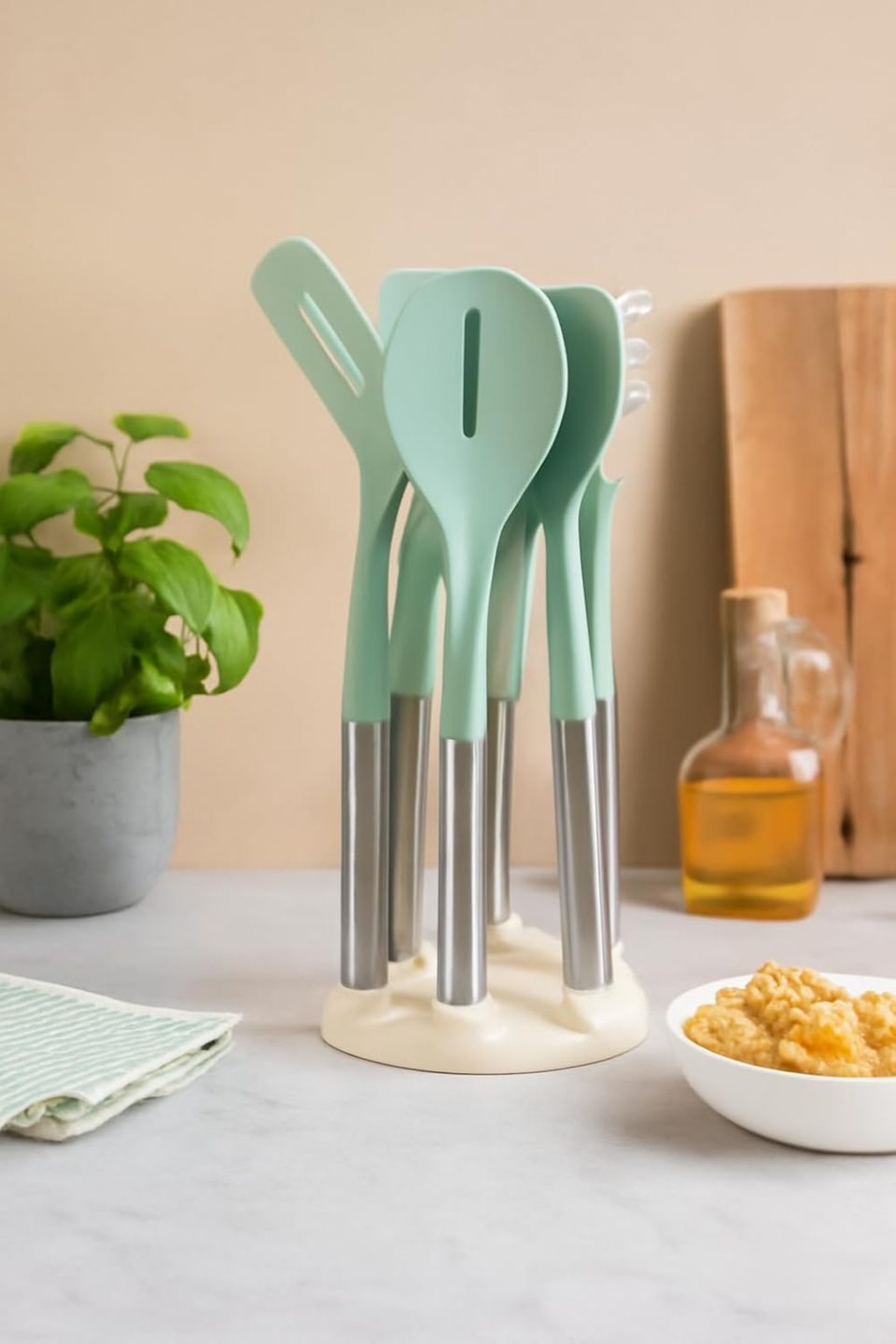 7-Piece Nylon Cooking Utensil Set with Durable Stainless Steel Handles – Heat-Resistant, Non-Scratch Kitchen Tools for Nonstick Cookware – Spatula, Ladle, Turner, Spoon & More (Green)