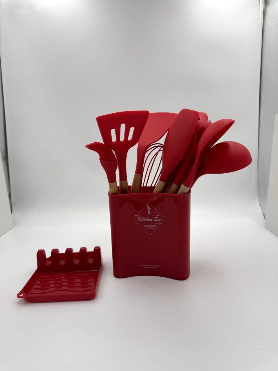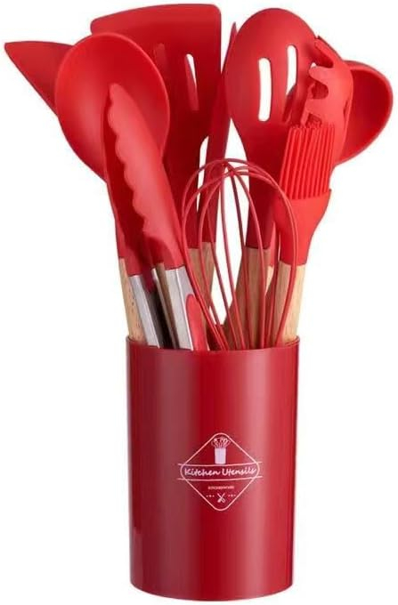 13-Piece Silicone Cooking Utensils Set Heat-Resistant,Non-Stick Kitchen Tools with Ergonomic Wooden Handles,Includes Spatulas,Turner,Ladle,Tongs,Whisk & More BPA-Free & Dishwasher Safe (Red)