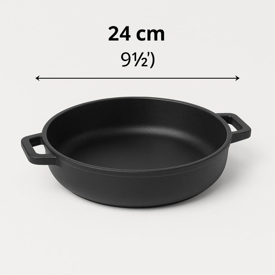 STURDY CAST IRON HANDLES: Equipped with robust cast iron handles, this pan is oven safe and ideal for recipes that transition from stovetop to oven. Enjoy a secure grip and enhanced durability, perfect for both everyday and high-heat cooking tasks.
