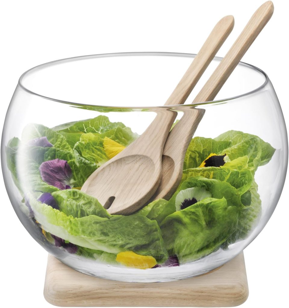 LSA International Serve Salad Set & Oak Base Ø27cm Clear| 1 Unit | Mouthblown & Handmade Glass | Hand Planed Wood | SZ53