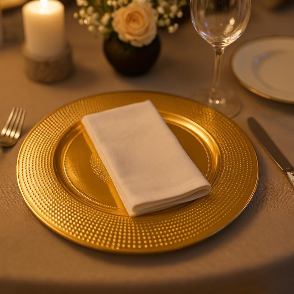 • 🔸 Multipurpose Decor – Events, Homes & Displays Not just for dining! Use this charger plate to elevate your centerpiece displays, candle arrangements, or seasonal decorations. Great for weddings, Eid, Diwali, Christmas, anniversaries, or upscale parties.