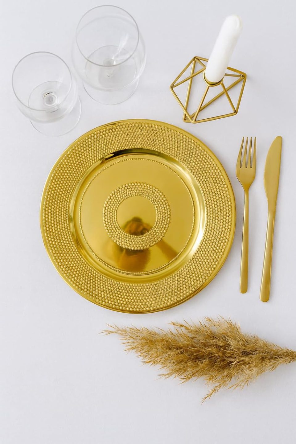 • 🔸 Elegant Gold Finish – Luxurious Table Accent Add a royal touch to your table setup with this exquisite 13-inch gold charger plate. The polished metallic finish reflects elegance and sophistication, making it ideal for both formal and festive dining arrangements. Whether you’re hosting a wedding, banquet, or family dinner, this plate is sure to impress.