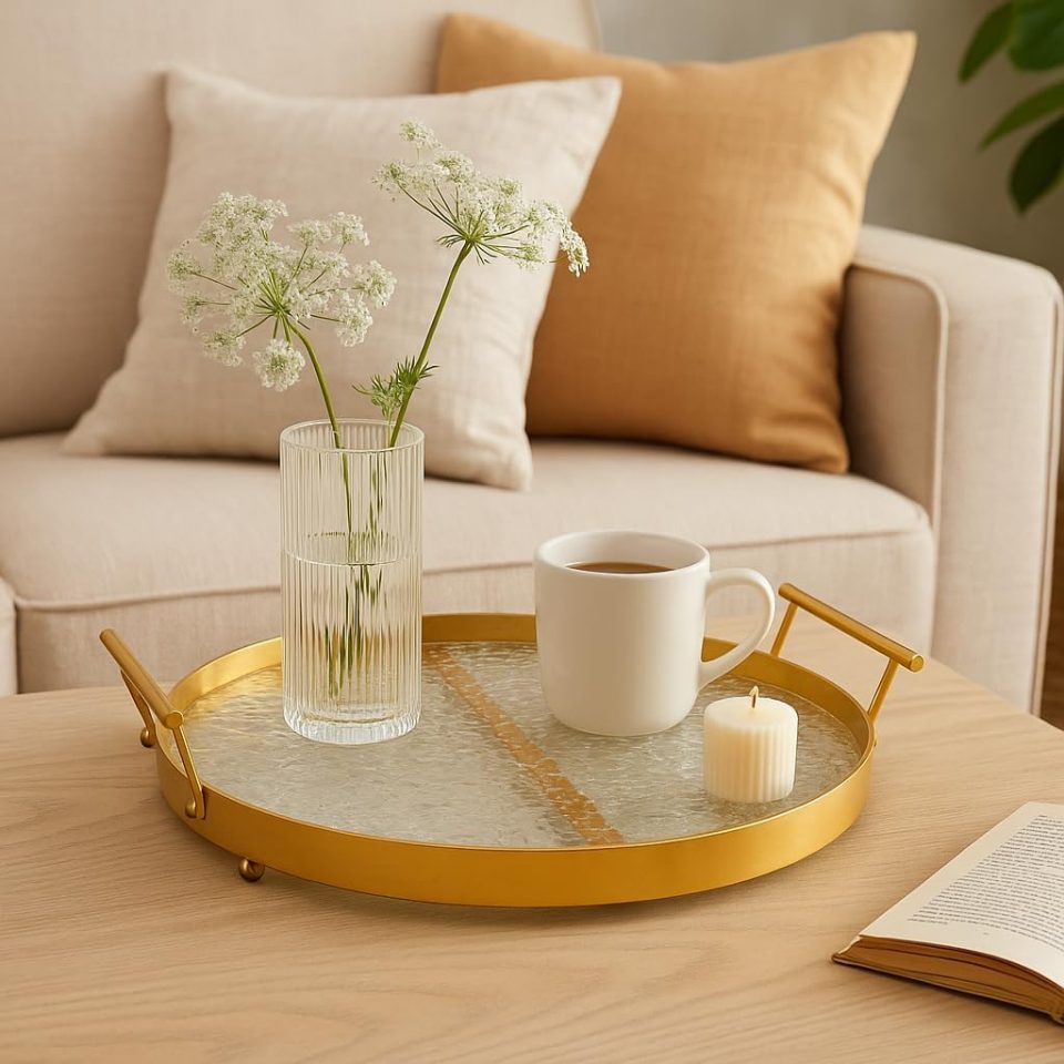 ✅ Multipurpose Use 🍸 – Ideal as a serving tray for drinks and snacks, or a display piece for candles, perfumes, jewelry, or makeup on vanities and coffee tables.