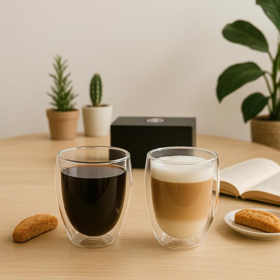 ☕ Set of 2 Elegant Glasses – 250ml double wall borosilicate glasses perfect for coffee, tea, juice, or water. Designed for temperature control and elegant visual effect in every sip.