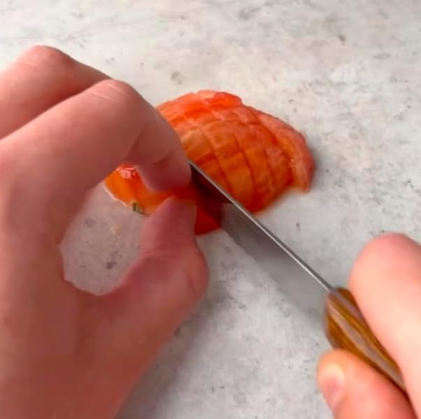 • 🍅 Hollow-Ground Edge to Prevent Sticking The blade is expertly designed with hollow-ground indentations that create air pockets while cutting, significantly reducing food sticking. This feature ensures smoother slicing of moist or starchy foods like tomatoes, cucumbers, and cheese, making your prep work faster and more efficient.