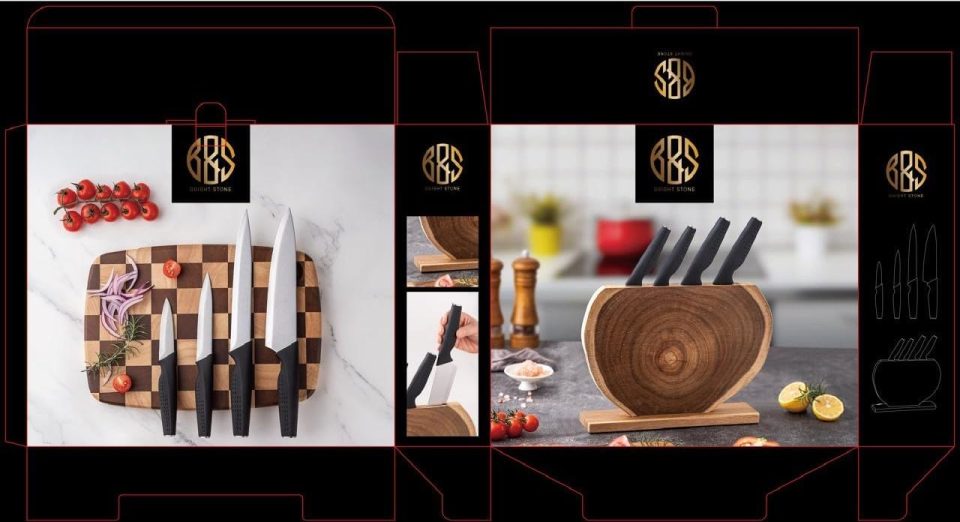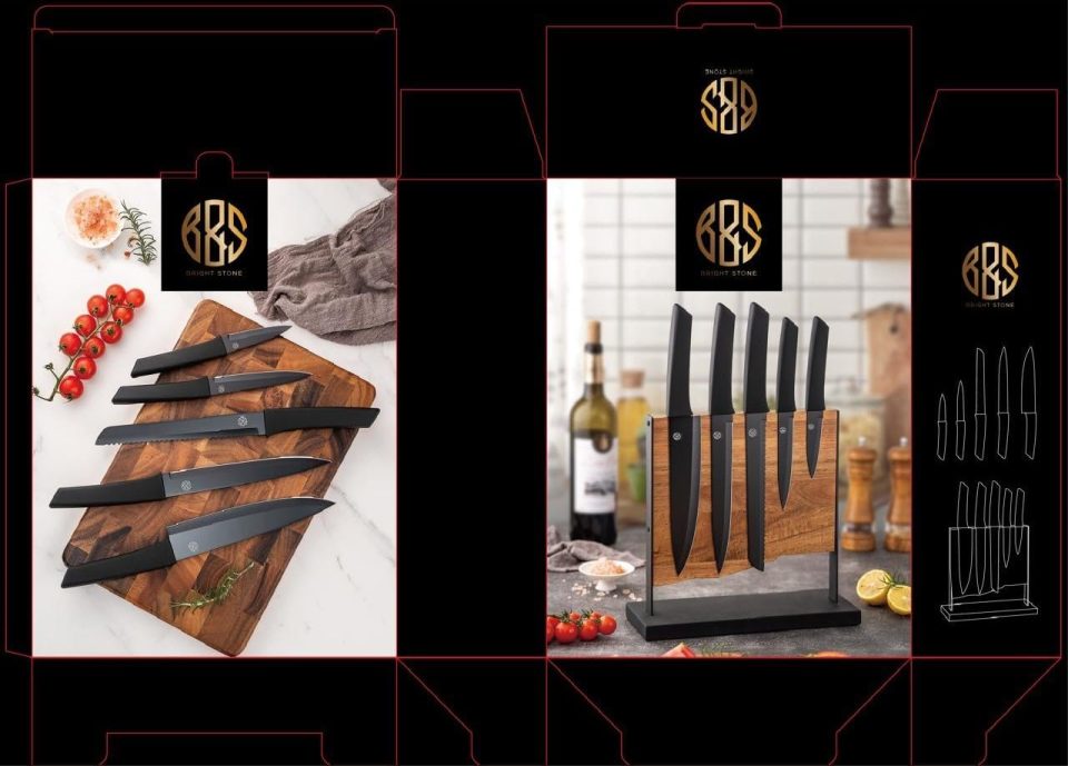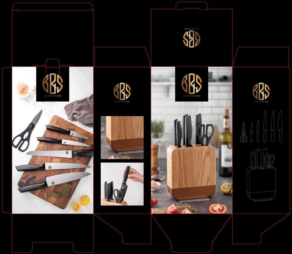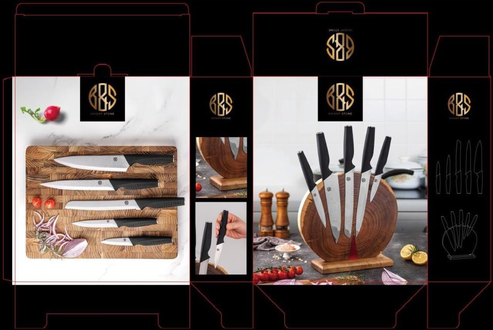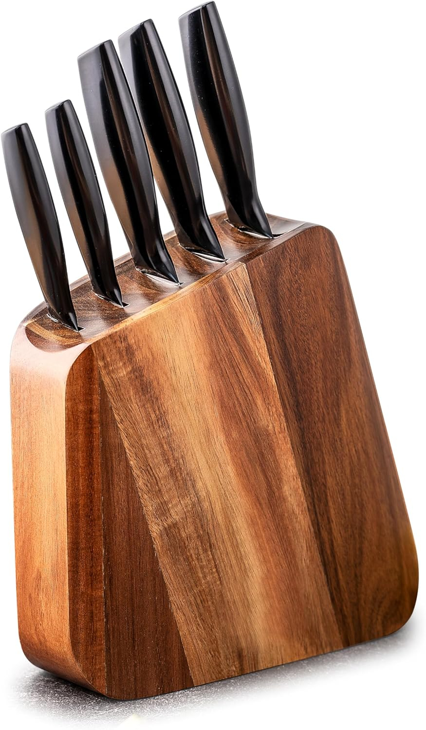 B&S Premium Wooden Knife Block Set with 5 Knives, Acacia Wood Stand, Black Handles,pass the European LFGB standard,ZT0014
