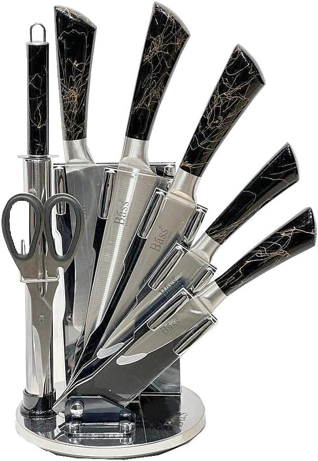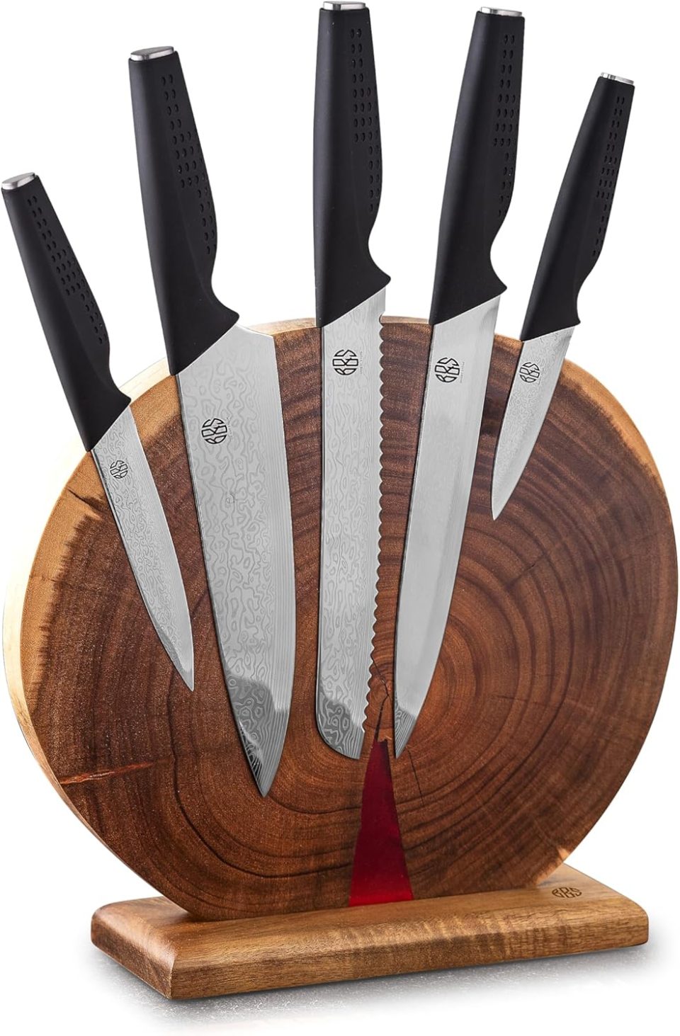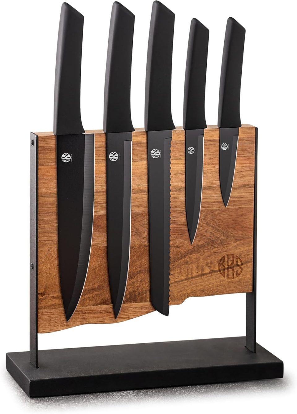 B&S Premium Kitchen Knife Set with Wooden Magnetic Stand, 5-Piece, Stainless Steel Blades, Black Handles pass the European LFGB standard,ZT0008