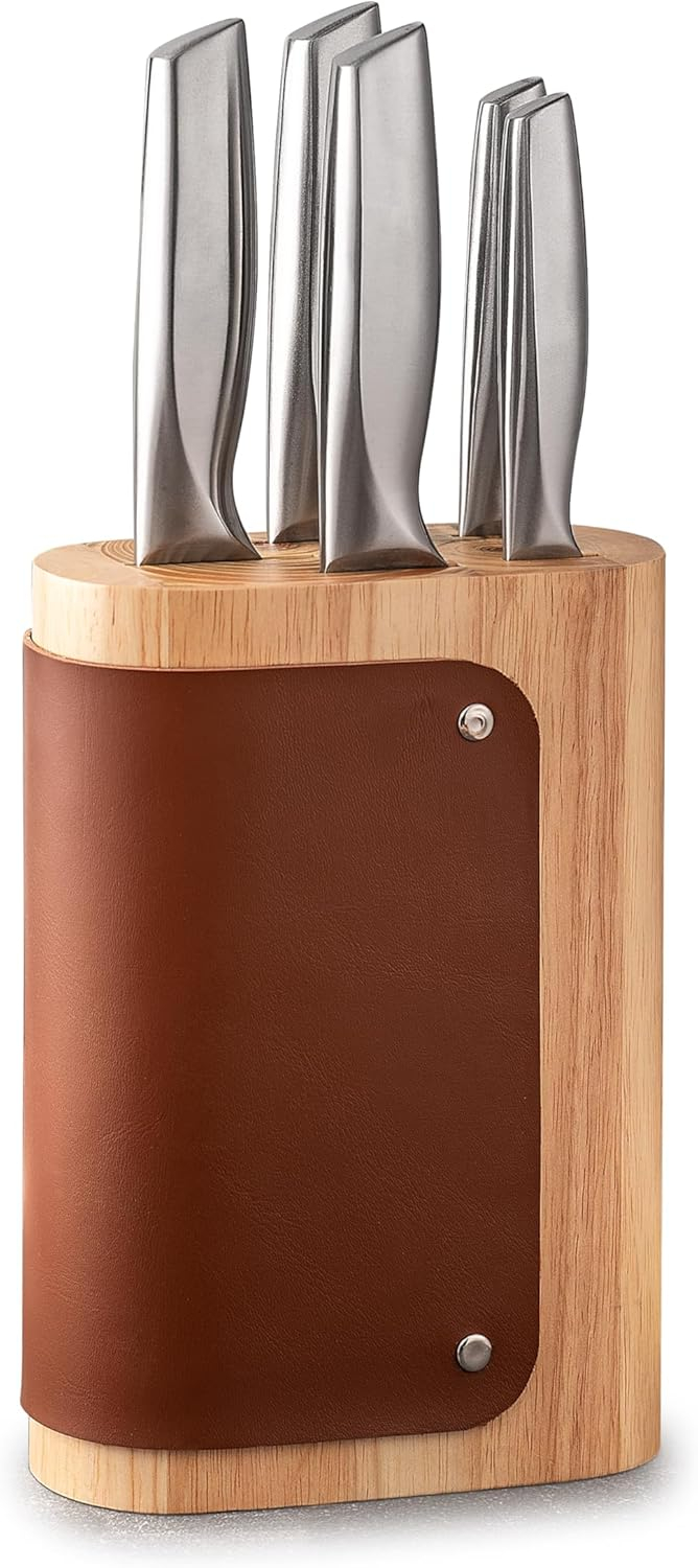 B&S Premium Kitchen Knife Block Set with Wooden Stand, Brown Leather Accent, Stainless Steel Blades pass the European LFGB standard,ZT0009