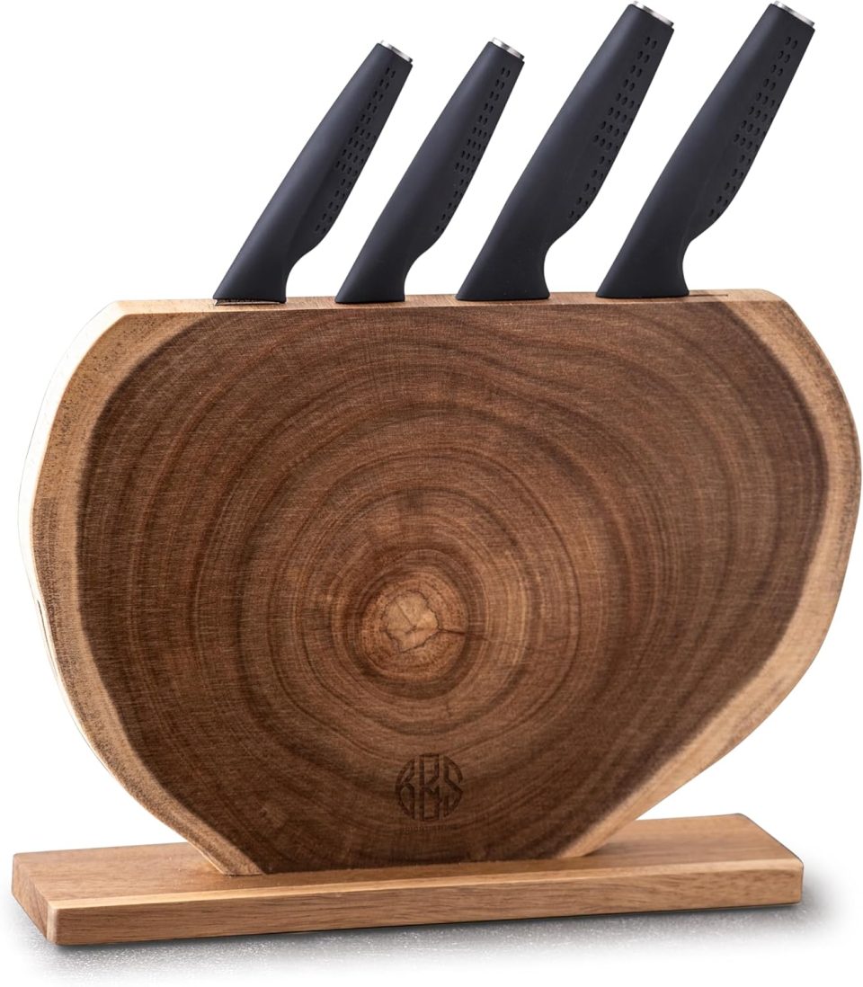 MAGNETIC STORAGE: Beautiful acacia wood block with powerful built-in magnets securely holds knives, complemented by a sturdy metal base for stability