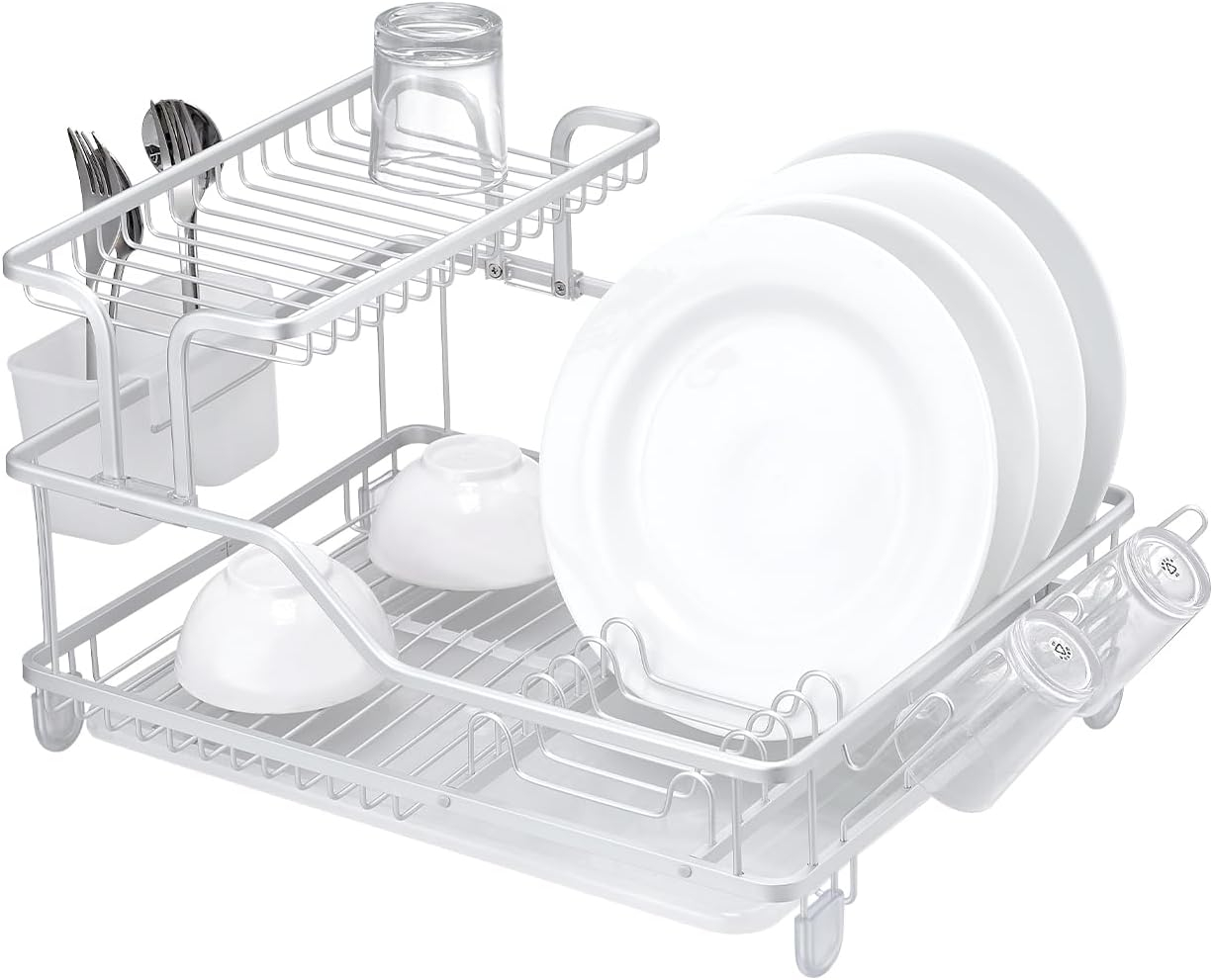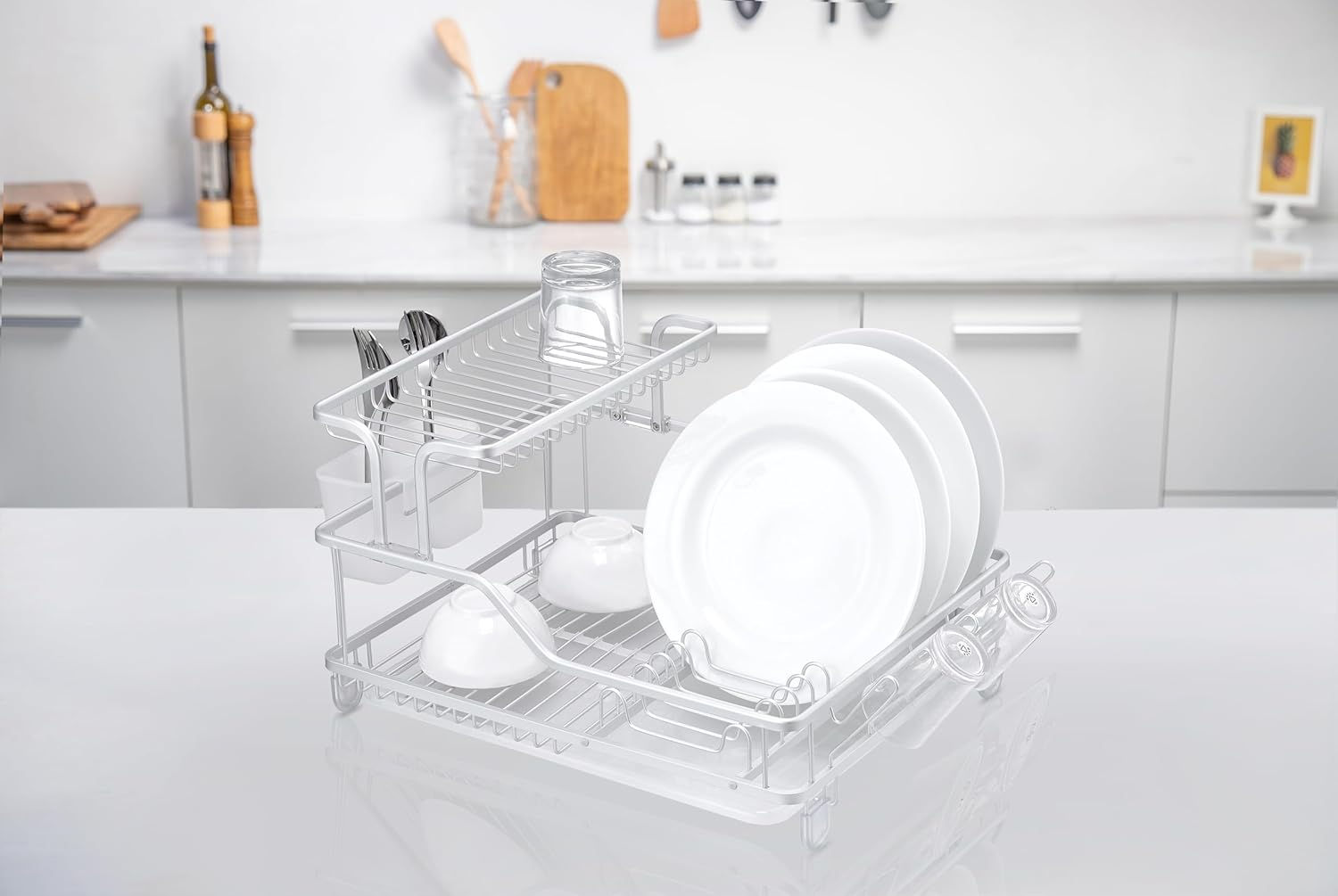 This practical dish rack is the perfect solution for efficiently drying dishes and utensils after washing. Its sturdy chrome-plated steel frame and multiple tiers provide ample space to organise plates, bowls, cups, and cutlery. The top rack features slots to hold dishes upright for optimal air circulation, while the lower basket securely holds utensils and smaller items. A detachable drip tray catches excess water, keeping your countertop dry. With its sleek design and space-saving construction, this dish rack is an essential addition to any modern kitchen. Effortlessly maintain a clutter-free and organised space while allowing your dishes to air-dry thoroughly.
