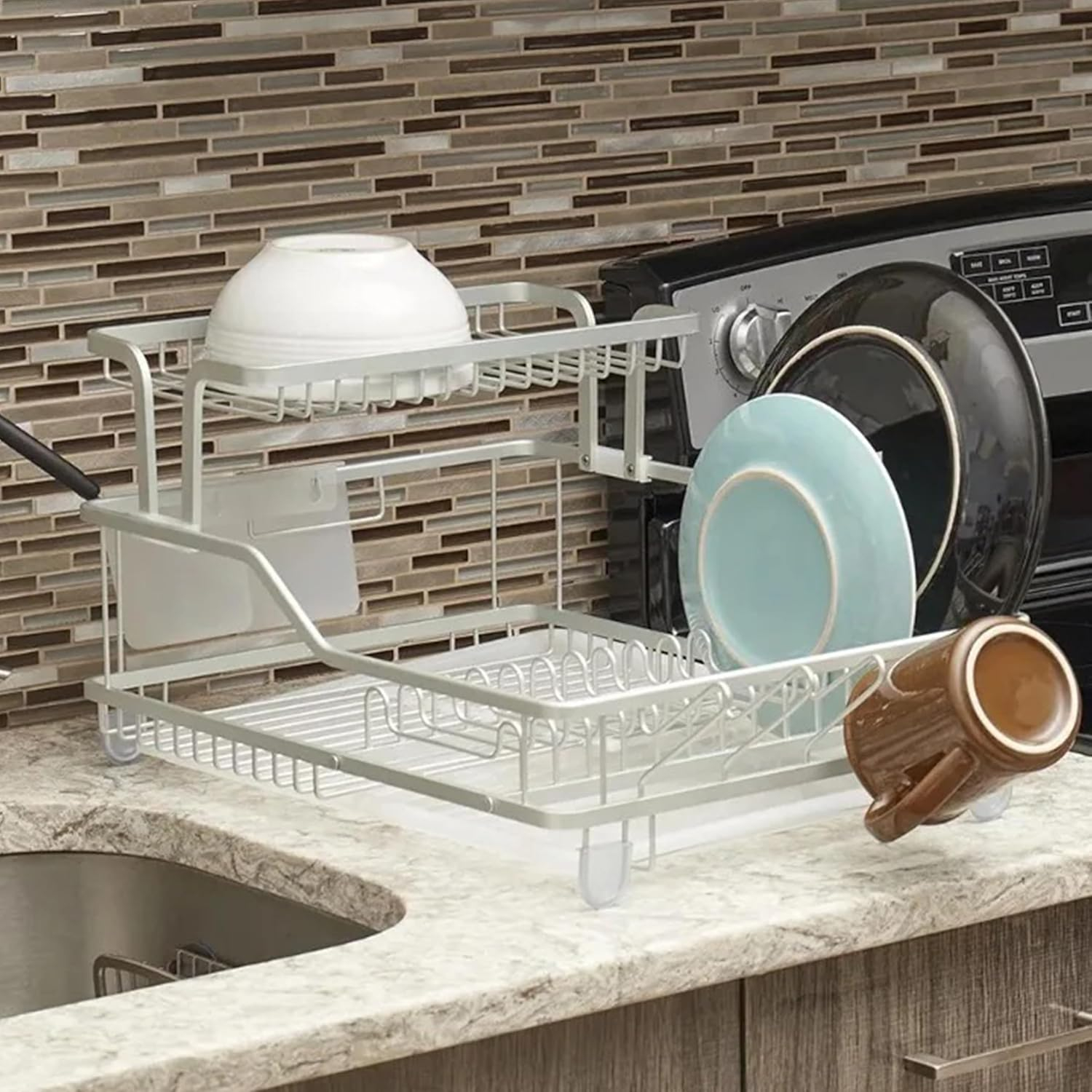 • MULTI-FUNCTIONAL DESIGN: This versatile dish drying stand accommodates dishes of various sizes with its spacious tiers and dedicated cutlery holders. Compact and space-saving, it is perfect for optimising kitchen counters while maintaining organisation.