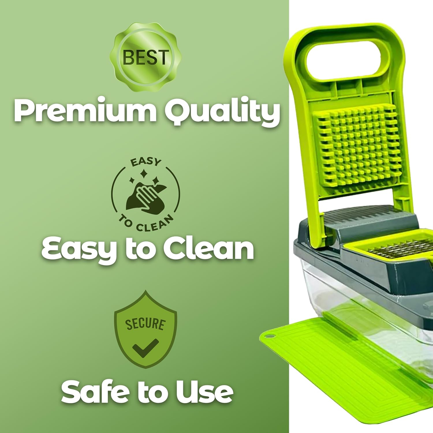 The compact design of this vegetable slicer and cutter ensures minimal storage space in your kitchen. Cleaning is a breeze with the included cleaning brush and dishwasher-safe parts.