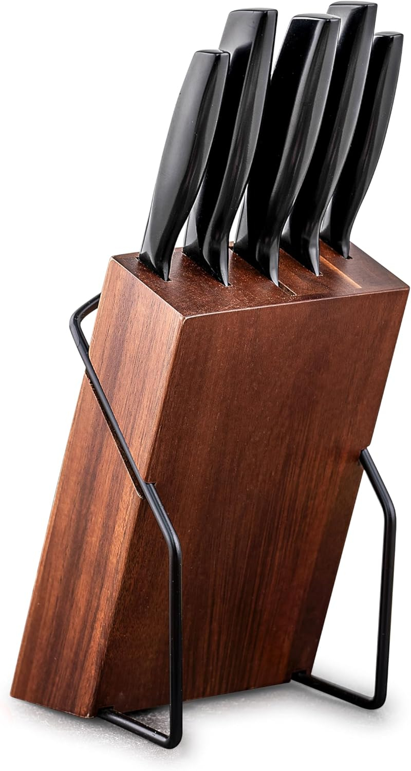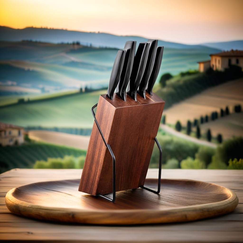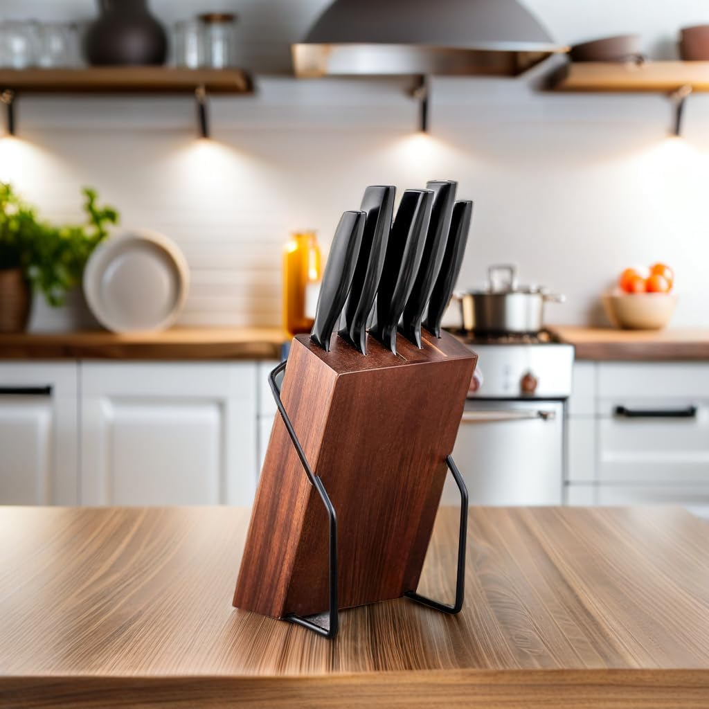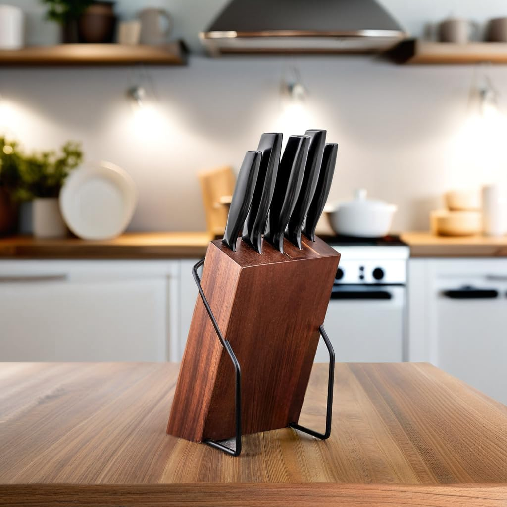 Elevate your culinary experience with this sophisticated knife set, featuring five premium kitchen knives displayed on an elegant woodenblock with a sturdy metal base. The set includes essential blade varieties for all your food preparation needs, each crafted with sleek black handles and high-quality steel blades that promise precise cutting performance. The thoughtfully designed magnetic wooden holder not only provides convenient storage but also adds a touch of modern aesthetics to your kitchen counter. The knives feature ergonomic handles for comfortable grip and control, while the contemporary black finish complements any kitchen décor. The space-saving vertical design makes it an ideal choice for both professional and home kitchens, keeping your knives organised, accessible, and safely stored. Each knife bears a distinctive logo, signifying its quality craftsmanship. The combination of natural wood and matte black elements creates a striking visual appeal that marries functionality with style.