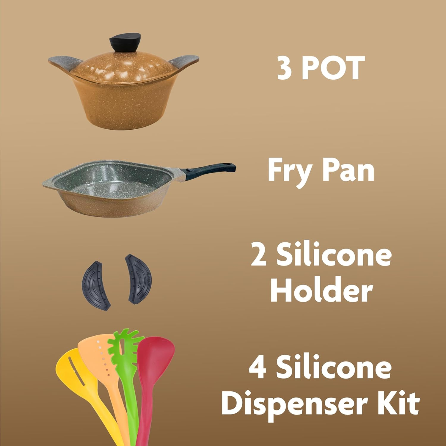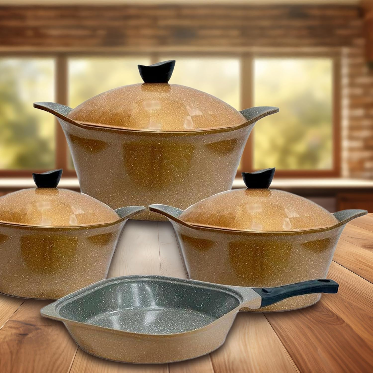 This set includes a versatile nonstick frying pan and 3 pots with integrated steam lids, making it perfect for frying, simmering, or sautéing. Complete with kitchen tools, it’s an all-in-one solution for modern kitchens.