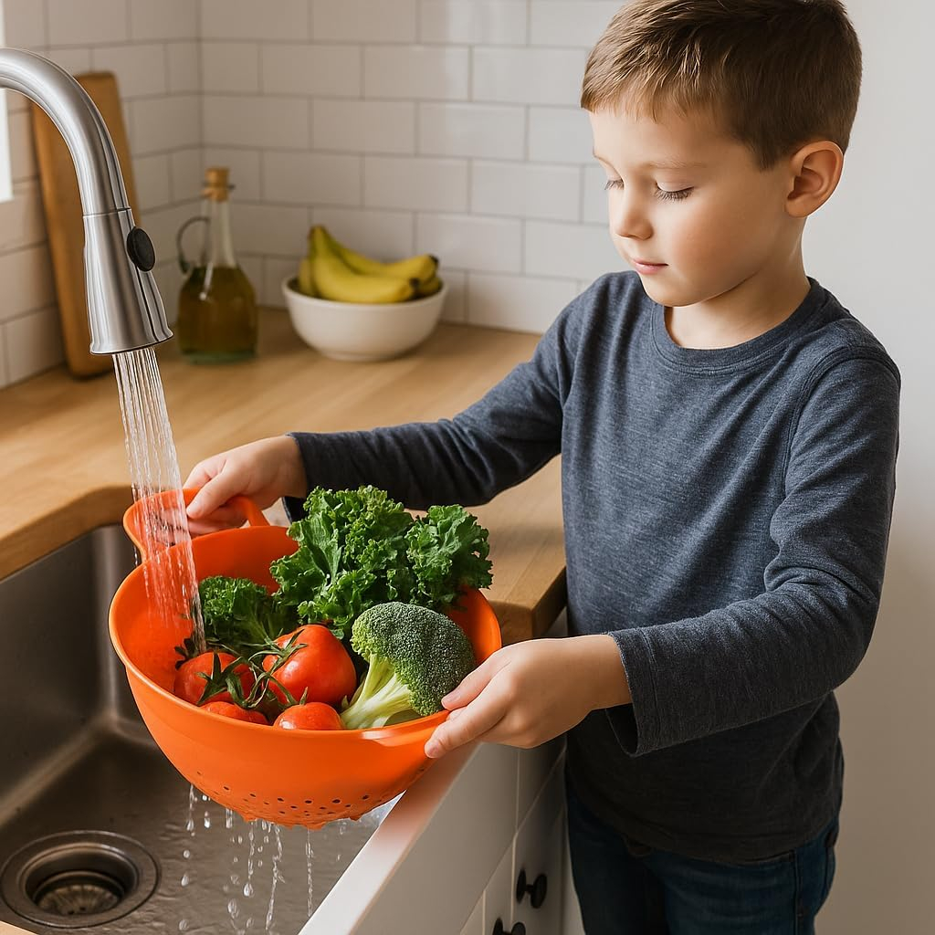 The base and sides of the colander feature multiple drain holes that ensure quick water release, preventing clogging and keeping your food fresh and dry. Ideal for washing leafy greens, rice, lentils, and more. ✅