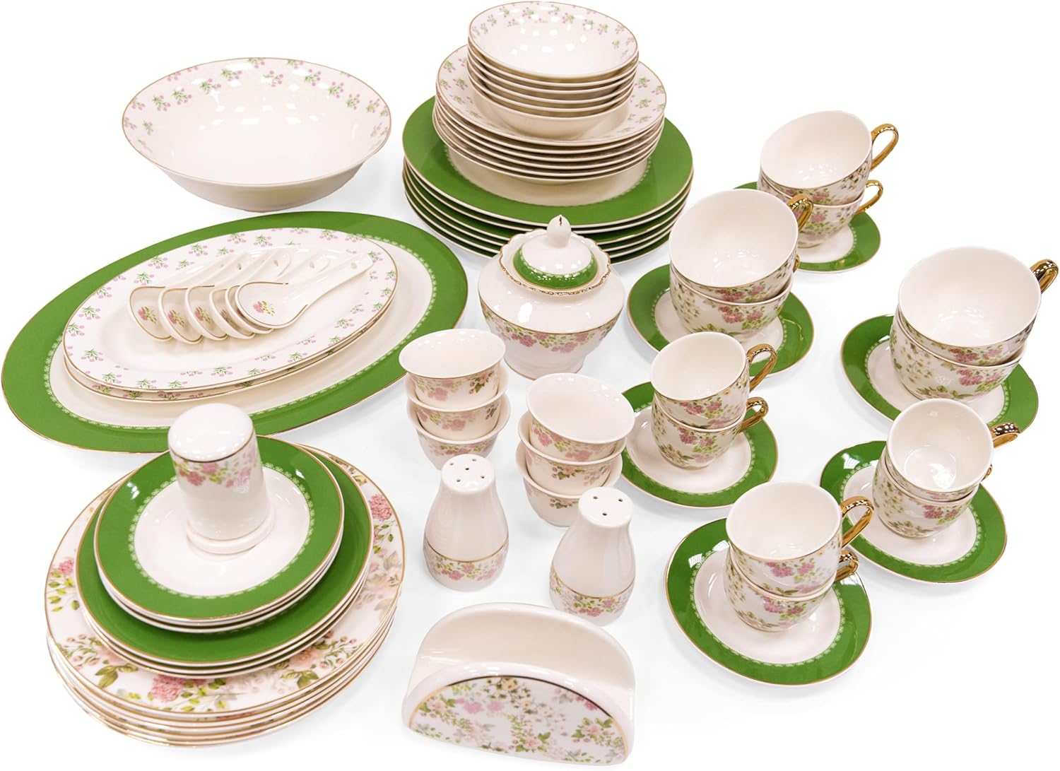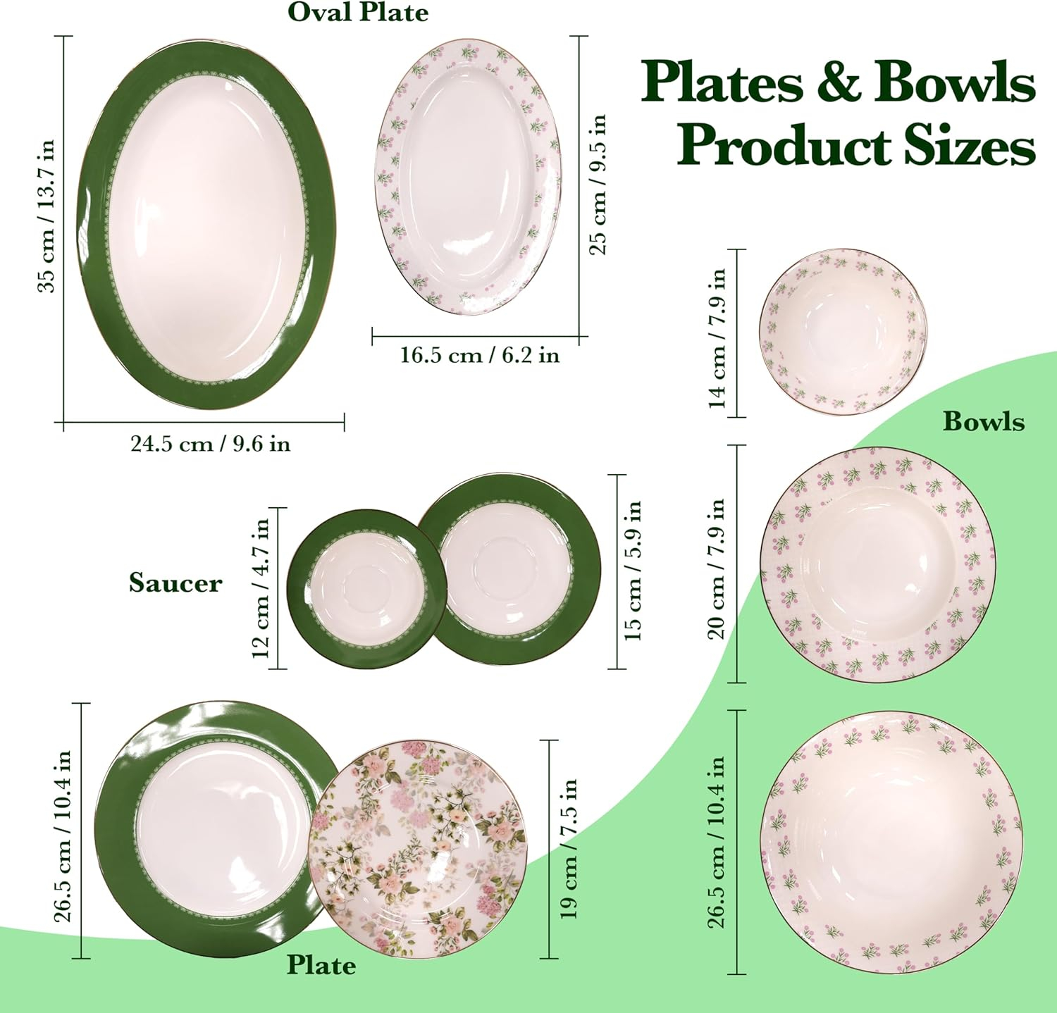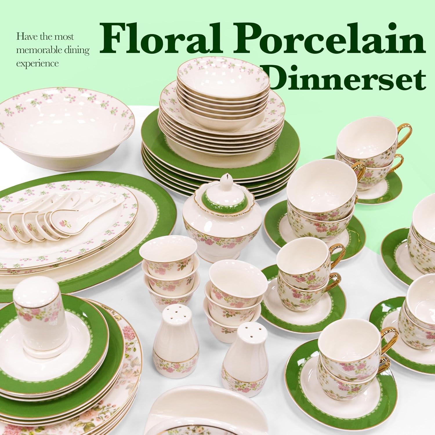B&S Porcelain Round Dinnerware Set | 71PCS Premium Ceramic Tableware | Dish Set with Floral Design | Vintage Porcelain Tea & Coffee Set | Microwave & Dishwasher Safe Plates and Bowls (Green & Pink)