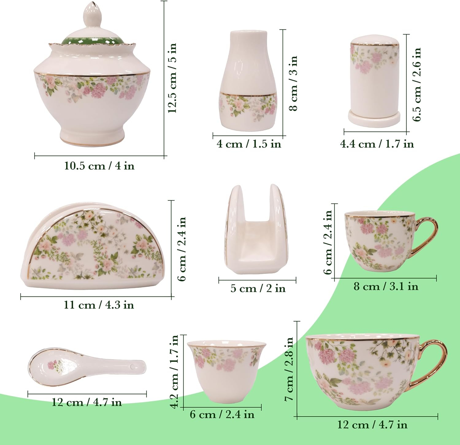 • Additional items include: Sugar Pot with Lid x1, Salt & Pepper Shakers x1, Napkin Holder x1, Toothpick Holder x1, Cawa Cups x6, and Soup Spoons x6.