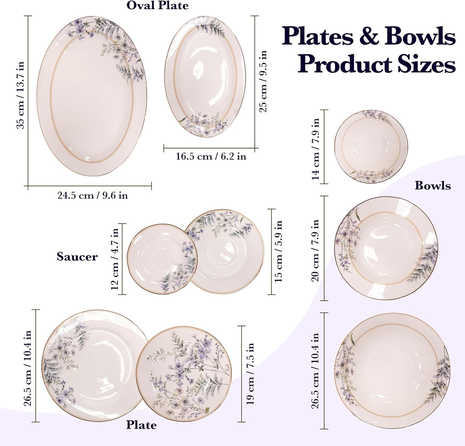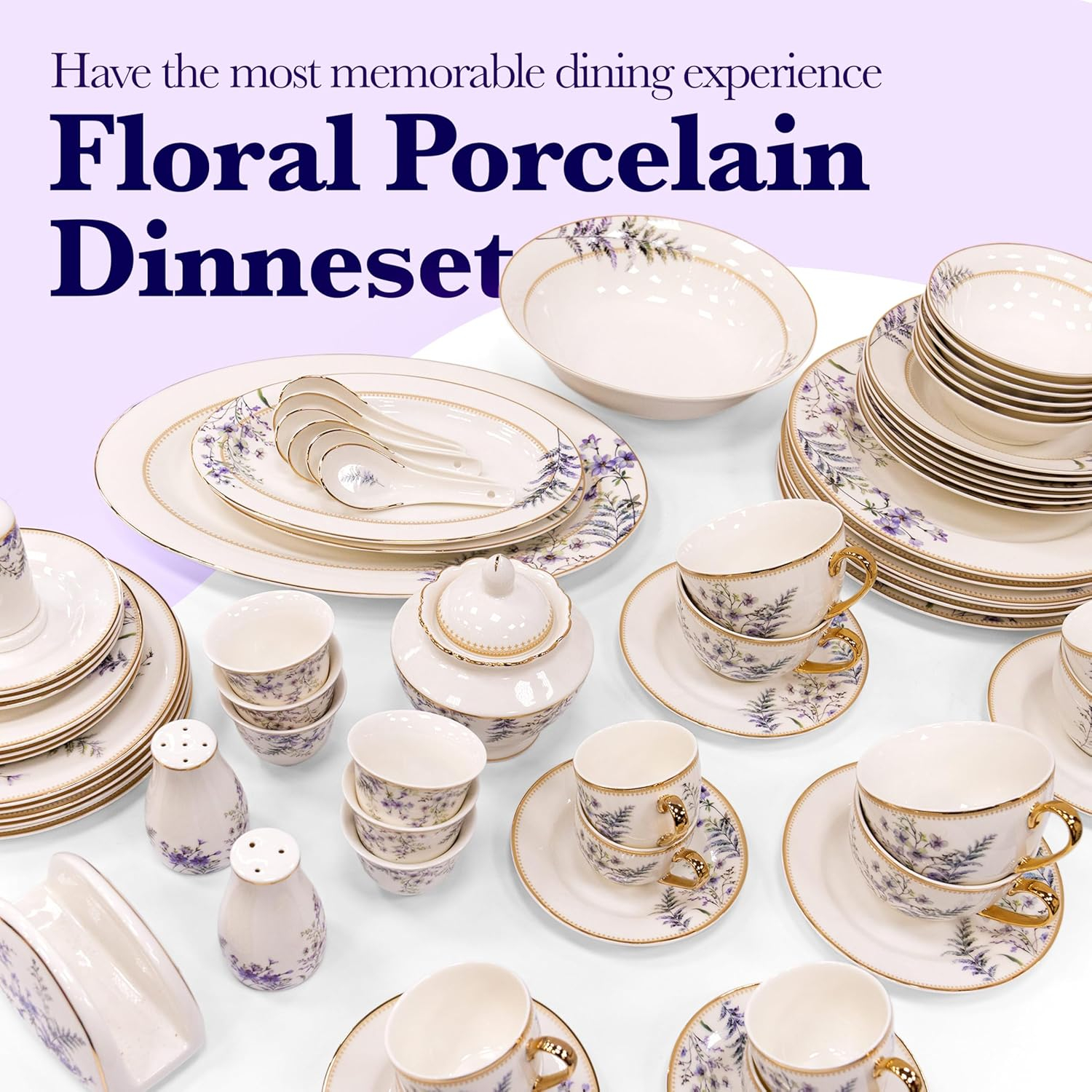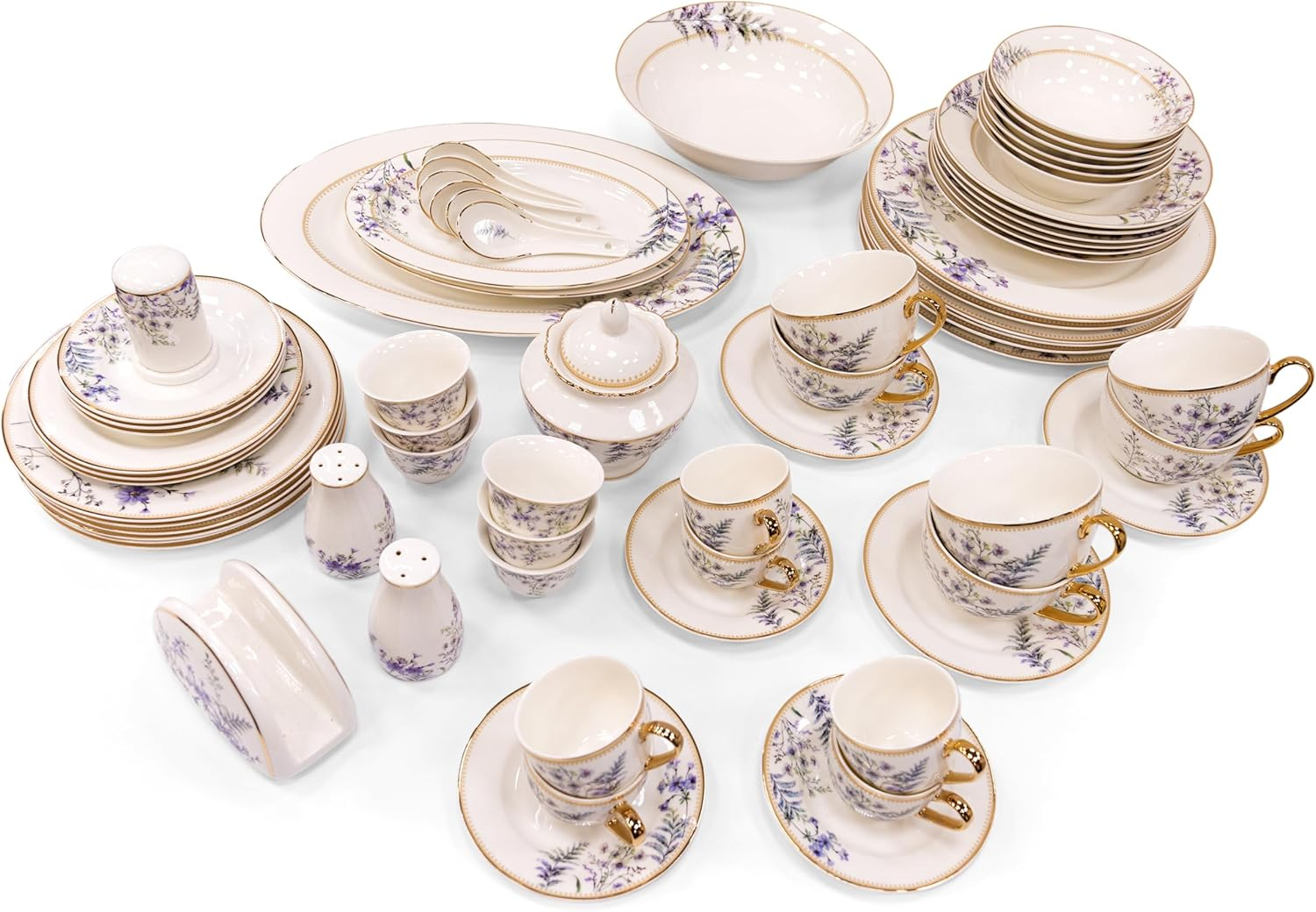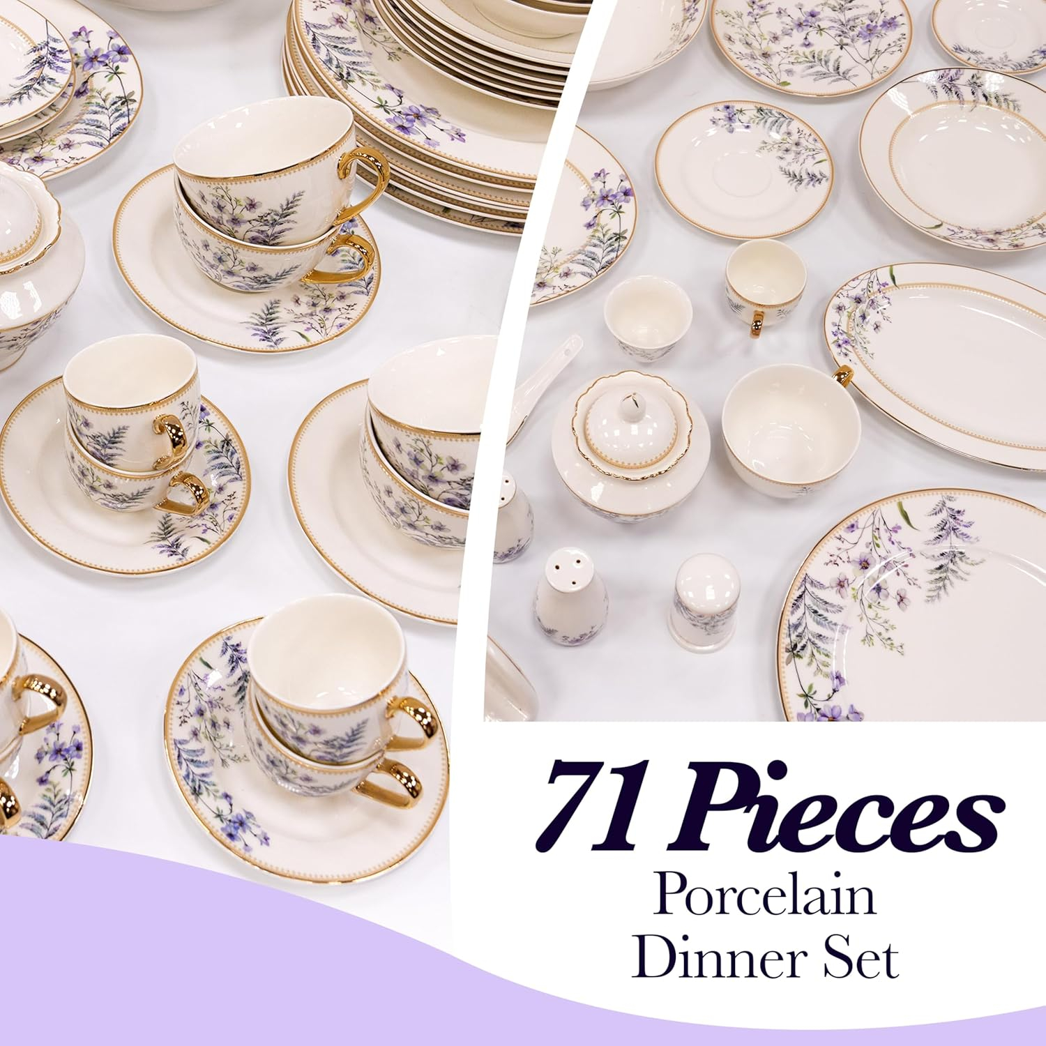 B&S Porcelain Round Dinnerware Set | 71PCS Premium Ceramic Tableware | Dish Set with Floral Design | Vintage Porcelain Tea & Coffee Set | Microwave & Dishwasher Safe Plates and Bowls (Purple)