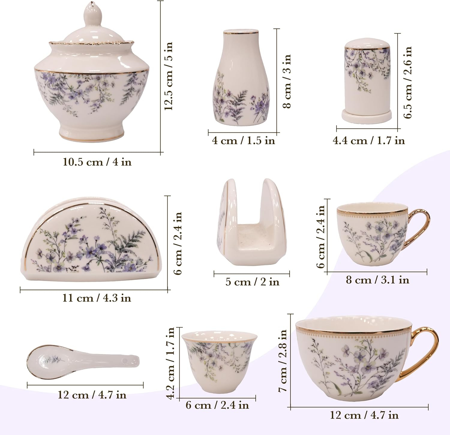 • Additional items include: Sugar Pot with Lid x1, Salt & Pepper Shakers x1, Napkin Holder x1, Toothpick Holder x1, Cawa Cups x6, and Soup Spoons x6.
