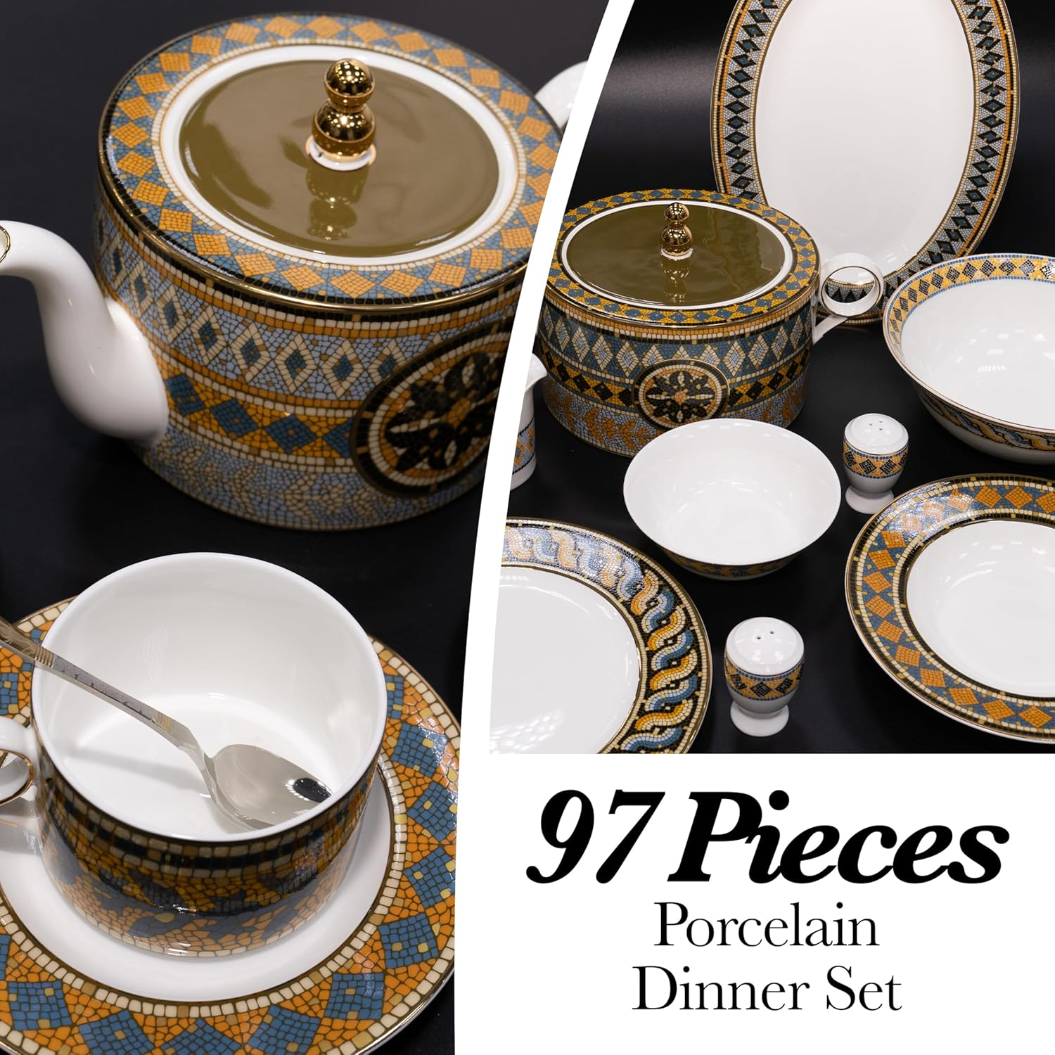 • ALL-INCLUSIVE SET: This Porcelain Dinnerware Plates and Bowls Set includes 12 dinner plates, bowls, tea cups, saucers, and more. With 97 versatile pieces, including a gravy pot, soup tureen, and sugar pot, this set has everything you need for a stylish, coordinated table setting.