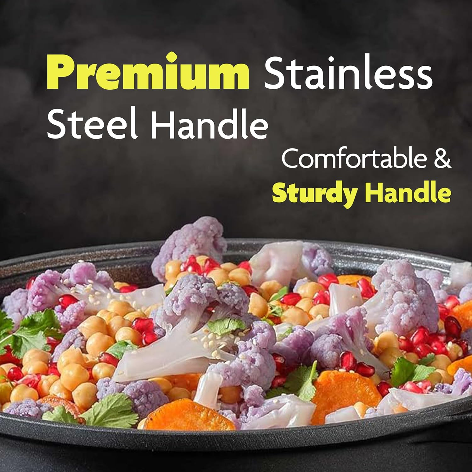 • STAINLESS STEEL HANDLES: Designed with heat-insulating stainless steel handles, this pan provides a comfortable, cool-to-touch grip. Easily transfer it from the stovetop to the table without worrying about safety, offering functionality and style for every meal.
