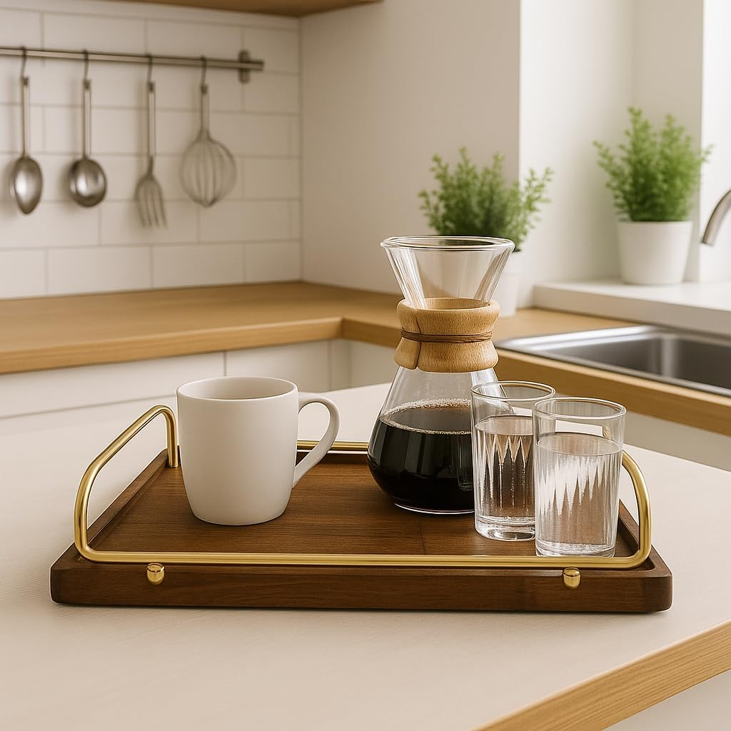 🎨 Modern Nordic Aesthetic: Designed in a sleek round shape, this tray combines natural wooden texture with clean metallic accents, making it a beautiful addition to your kitchen or tabletop decor.